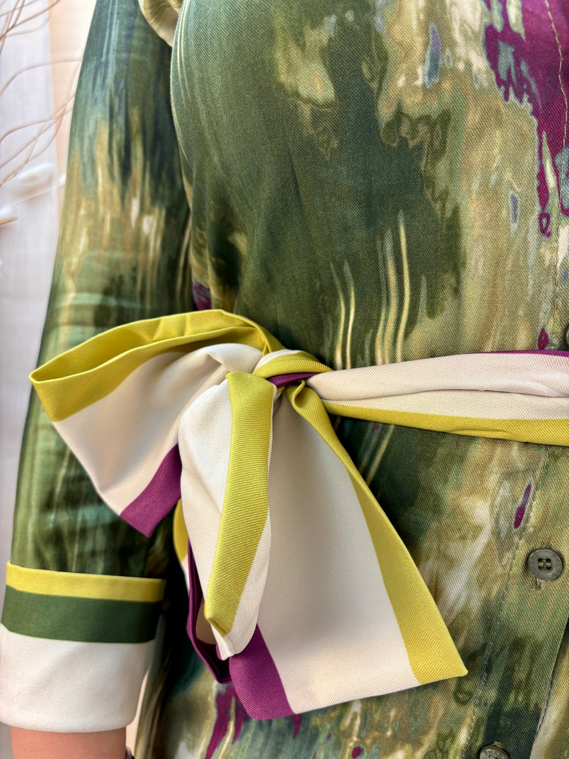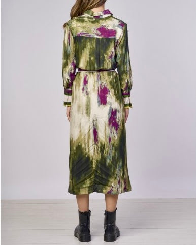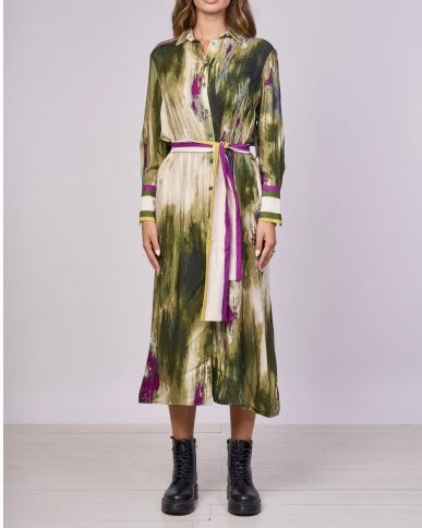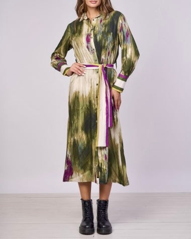 Questo abito chemisier midi è il capo perfetto per un look unico ed elegante. La sua stampa astratta, ricca di sfumature, lo rende un pezzo d'arte da indossare. Il modello a camicia con bottoni e cintura in vita valorizza la figura, mentre il tessuto leggero e fluido garantisce il massimo comfort. Ideale sia per occasioni speciali che per un appuntamento in città, questo abito si abbina facilmente a stivali o tacchi per un tocco di classe in più.