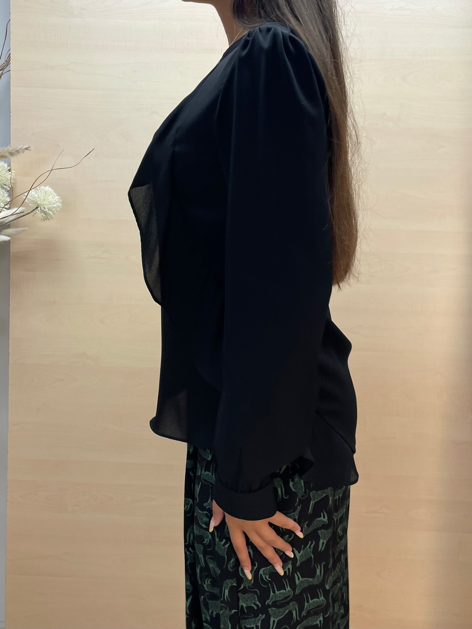 Blusa nera con drappeggio e volant frontali