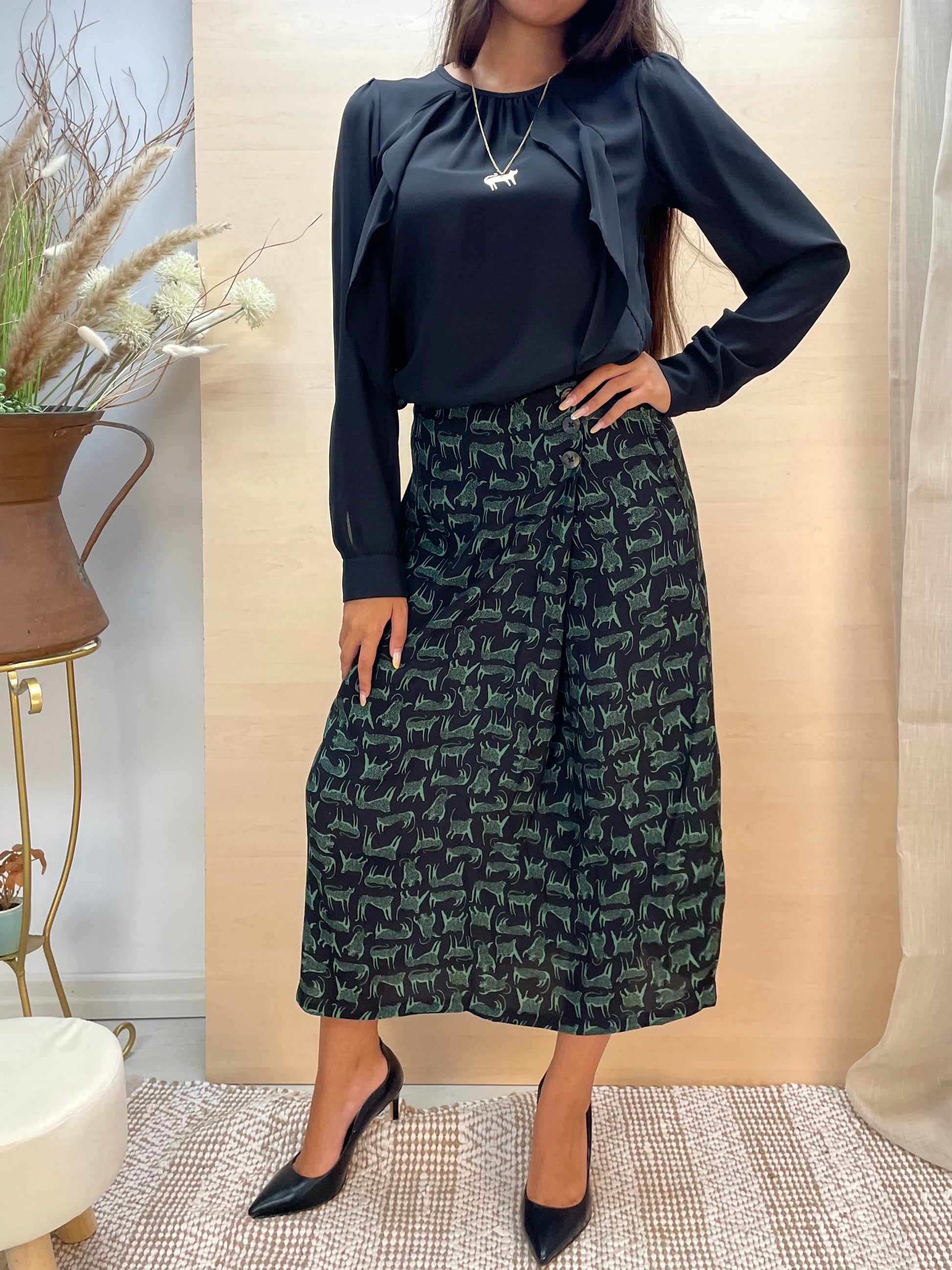Una blusa elegante e versatile, caratterizzata da un raffinato drappeggio sul davanti e da due volant verticali che scendono dal carré fino all’orlo, creando movimento e leggerezza. Realizzata in tessuto fluido, è leggermente lunga per poter essere indossata sia morbida sopra il pantalone sia rimborsata all’interno per un look più curato. Il colore nero intramontabile la rende un capo essenziale e facile da abbinare, perfetto da avere sempre nell’armadio per look casual o più sofisticati.