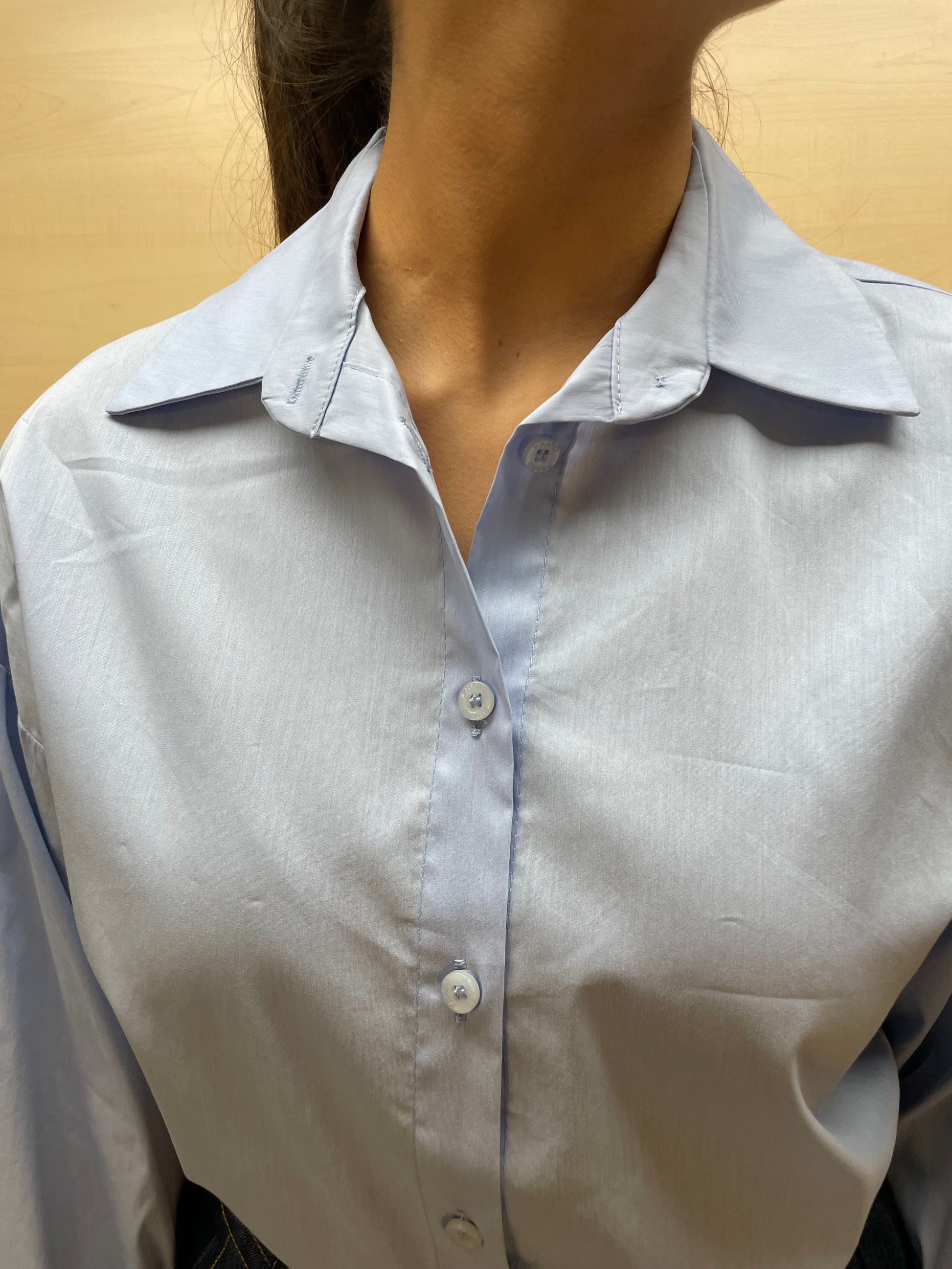 Camicia dal taglio over in fresco cotone celeste, con spalle leggermente scese per un look rilassato e contemporaneo. Versatile e senza tempo, si presta ad abbinamenti eleganti con un blazer e pantaloni sartoriali, ma anche a outfit più informali con denim o gonne casual. Può essere indossata stesa dentro ai pantaloni per uno stile più curato, oppure lasciata fuori per un effetto disinvolto e moderno.