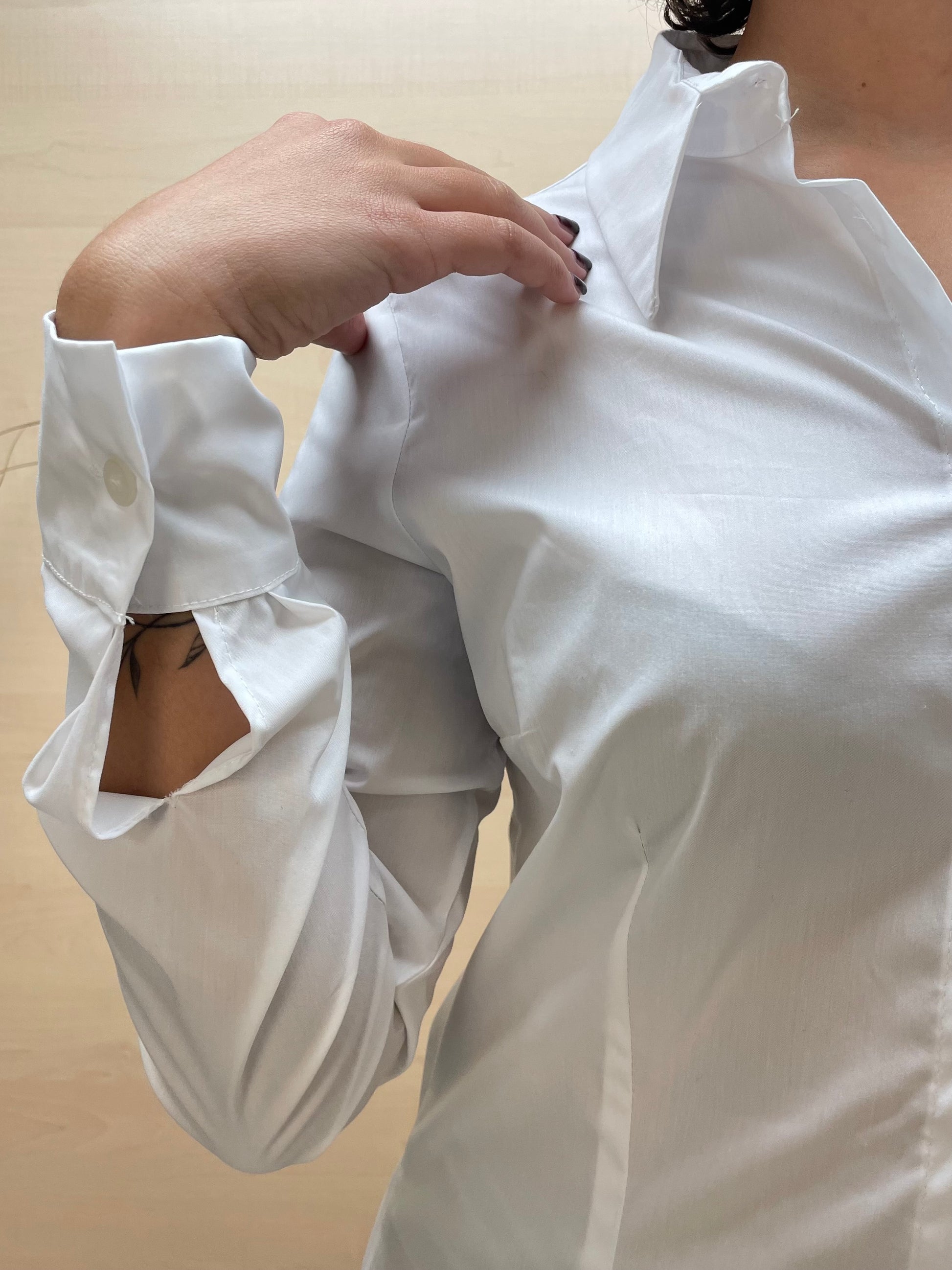 Un capo essenziale da avere nell’armadio: la camicia bianca classica con un taglio leggermente più stretto in vita valorizza la silhouette senza rinunciare al comfort.