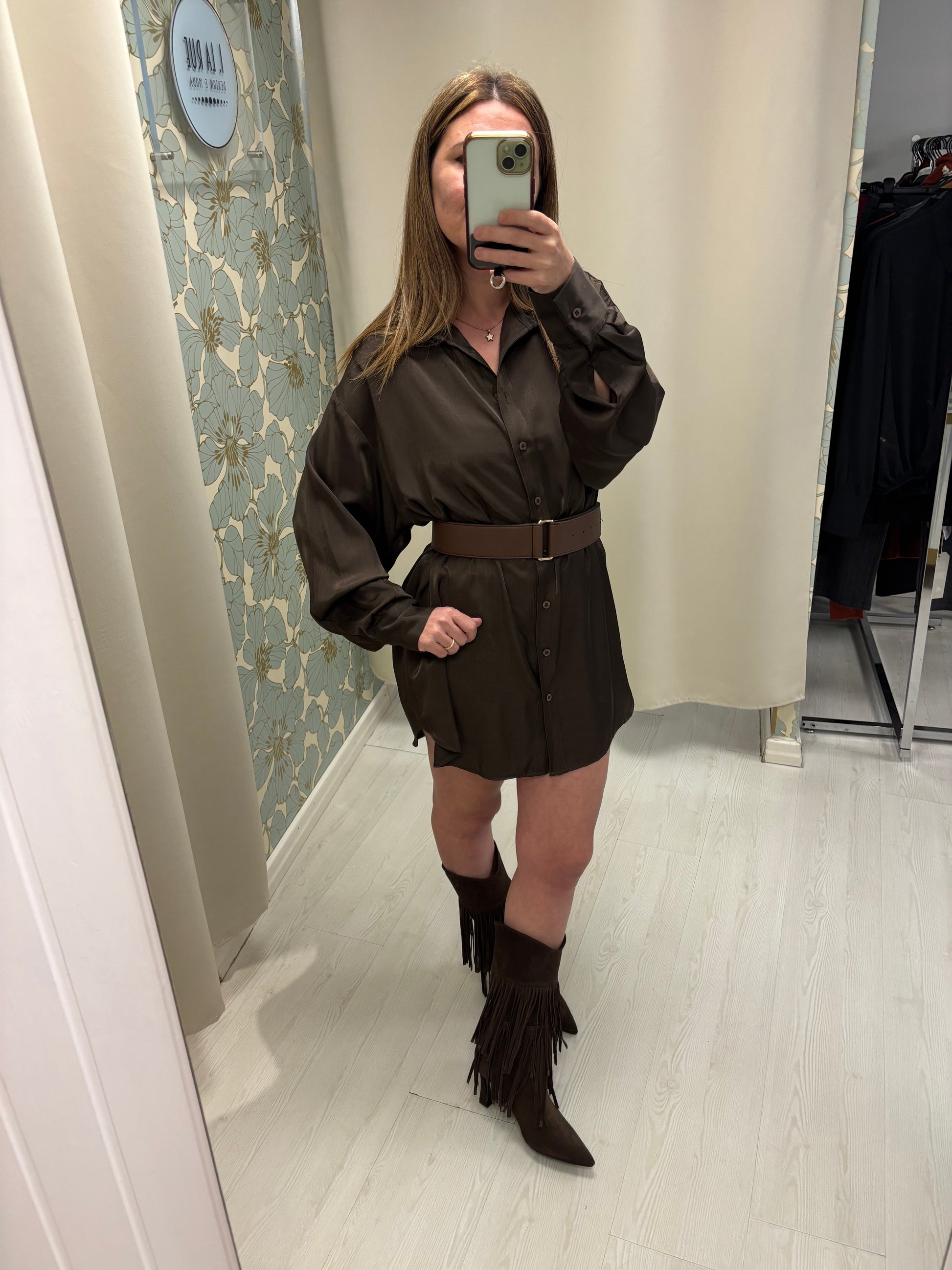 Questa camicia lunga in tessuto cangiante color moka è realizzata in un materiale prezioso, simile al taffetà, che rivela la trama del filo e dona riflessi sofisticati e profondi.