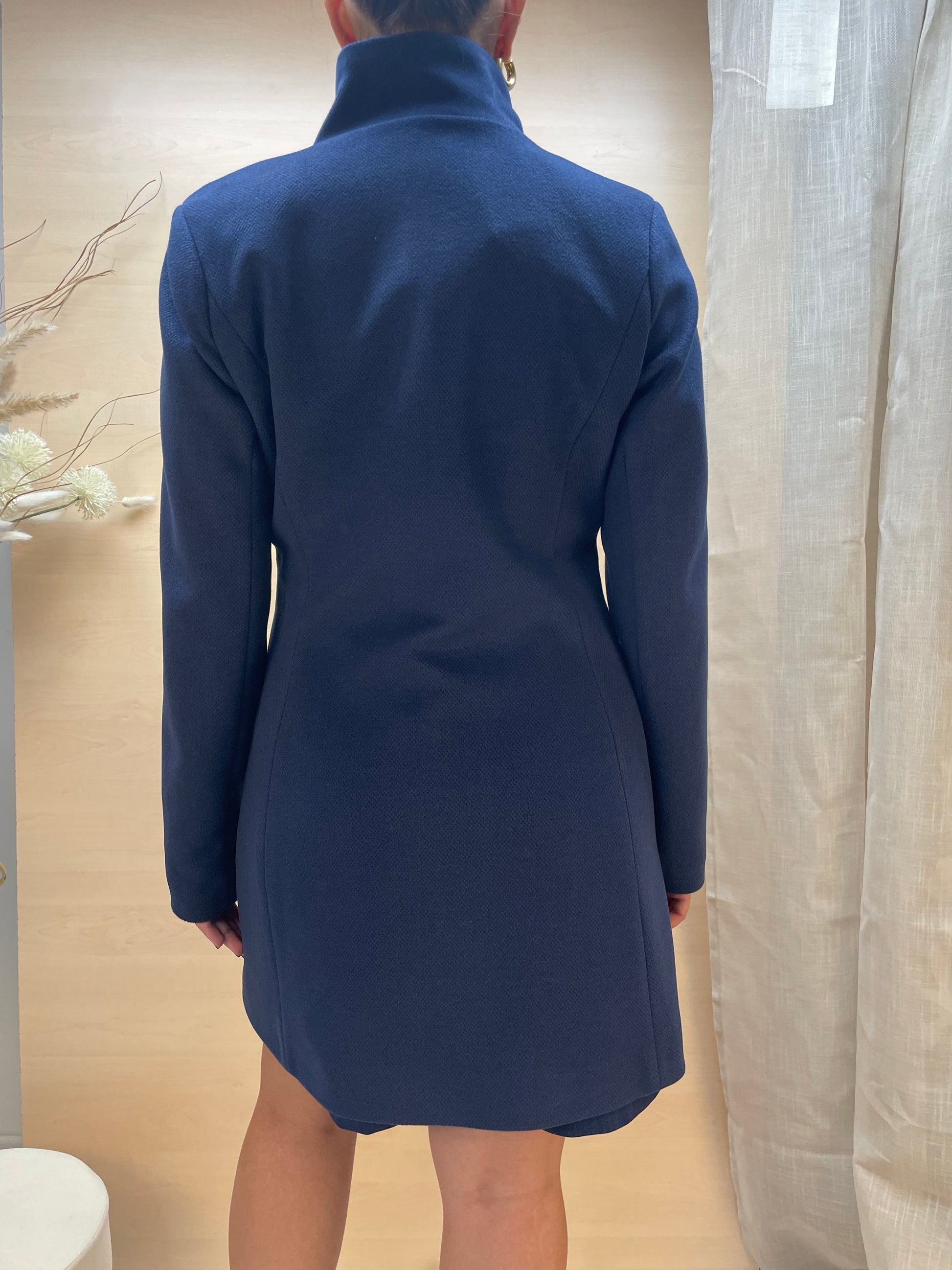 Un cappotto blu intenso, dal taglio elegante ma versatile, con chiusura frontale a bottoni che dona un aspetto classico e raffinato. Il collo alto protegge dal freddo e regala un tocco sofisticato, mentre la linea leggermente sfiancata in vita valorizza la silhouette senza risultare troppo aderente. Le maniche sono pulite e lineari, il fondo leggermente dritto, e il tessuto compatto e morbido rende il capo ideale sia per un look quotidiano che per un’occasione più formale.
