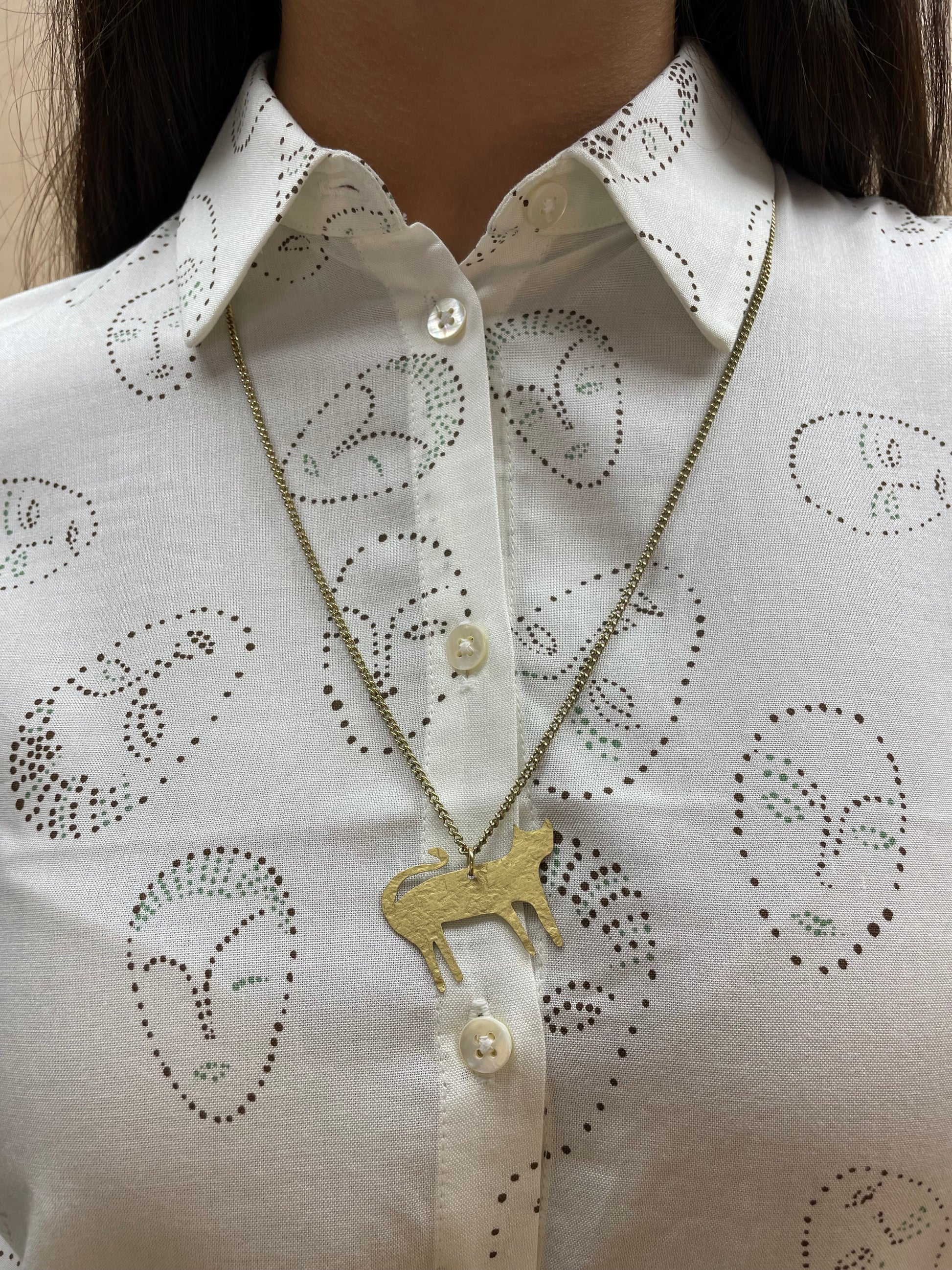 Collana in 100% ottone con pendente a forma di sagoma di gatto, dal design essenziale e delicato. Un accessorio originale e femminile, perfetto per aggiungere un tocco di personalità al look quotidiano.