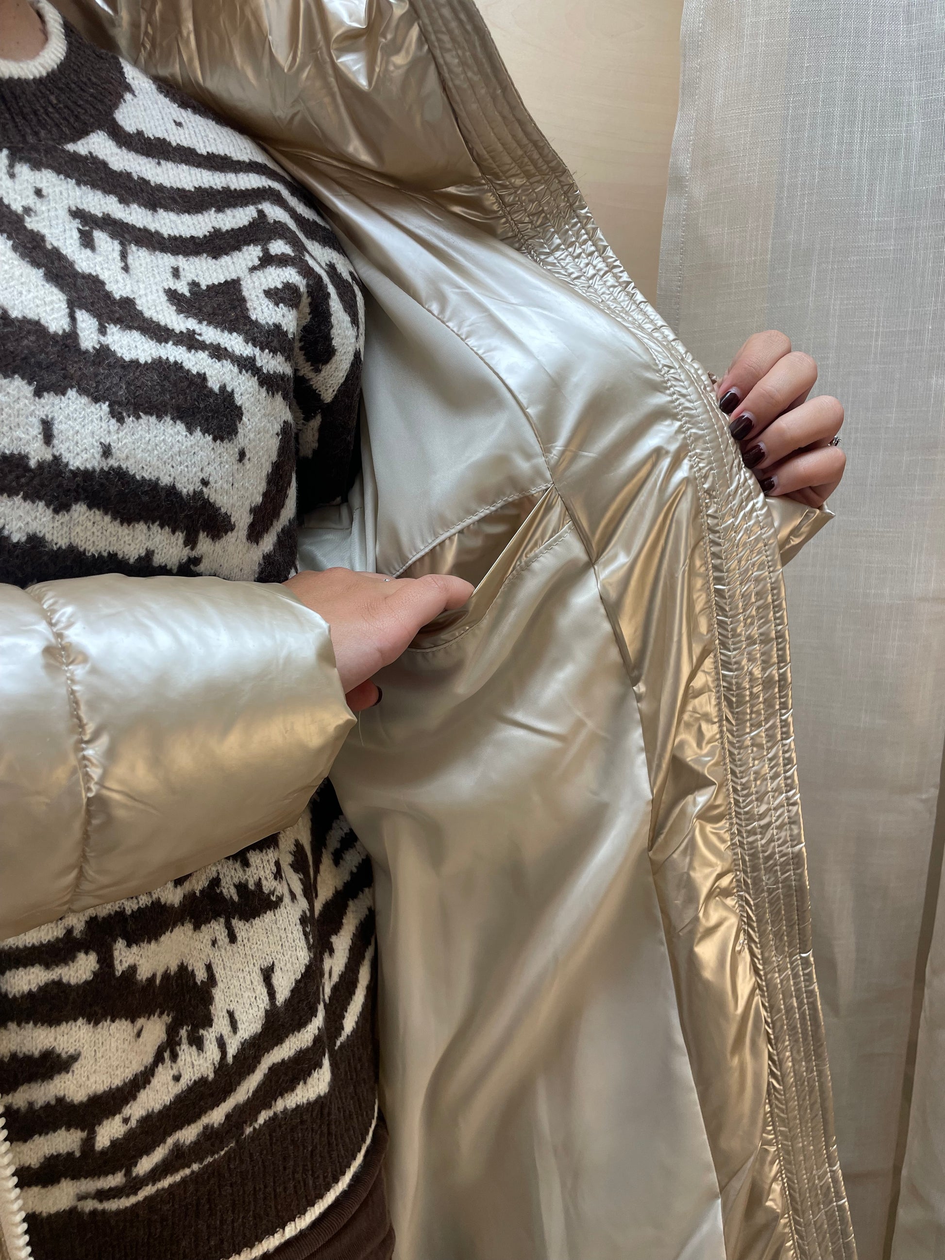 Raffinato e avvolgente, questo piumino lungo unisce calore e stile in un unico capo. Realizzato in tessuto effetto satinato color champagne, illumina il look con discreta eleganza. La trapuntatura a quadri regolari dona un design moderno e femminile, mentre la cintura coordinata in vita permette di esaltare la silhouette senza rinunciare al comfort.