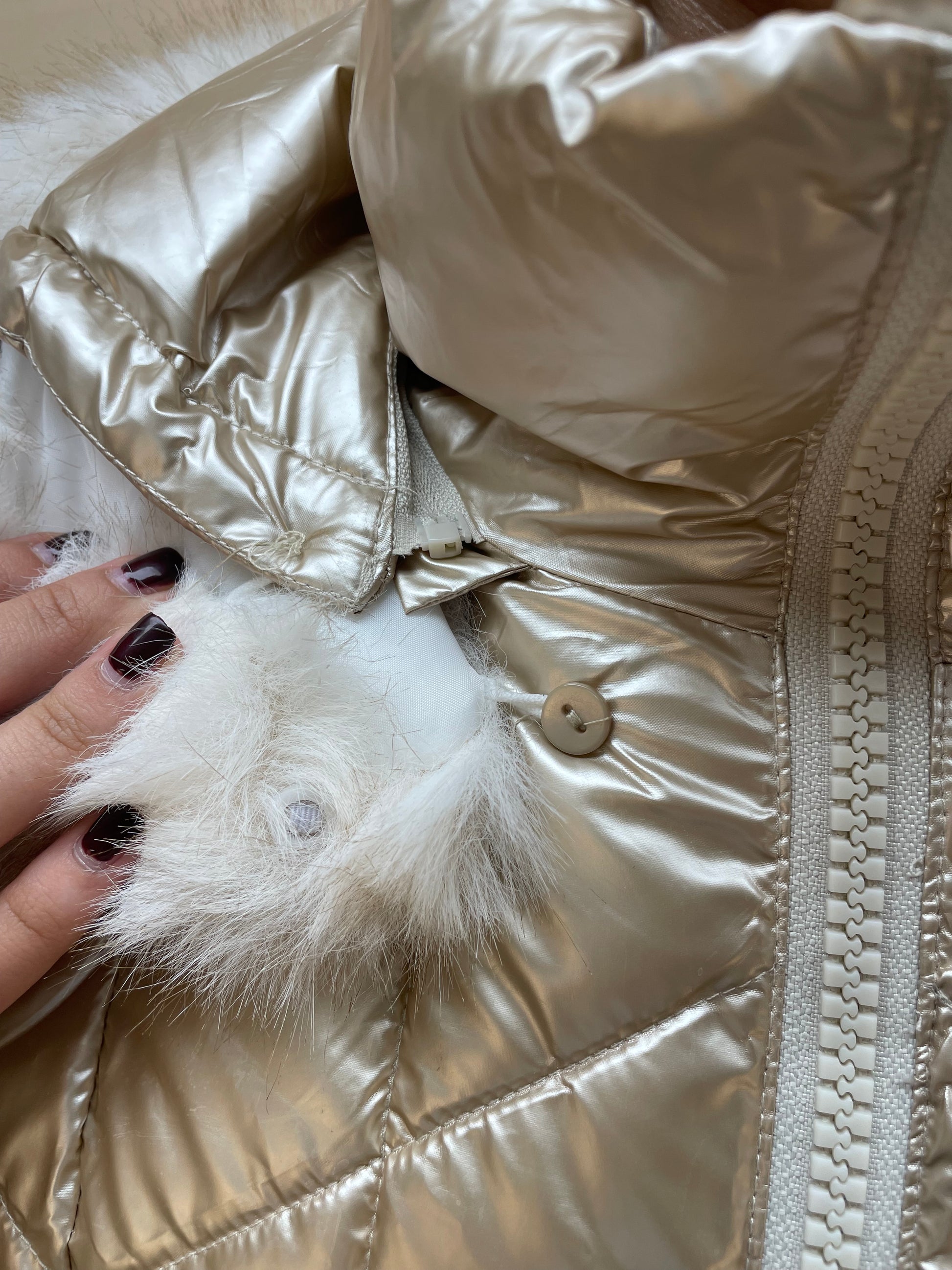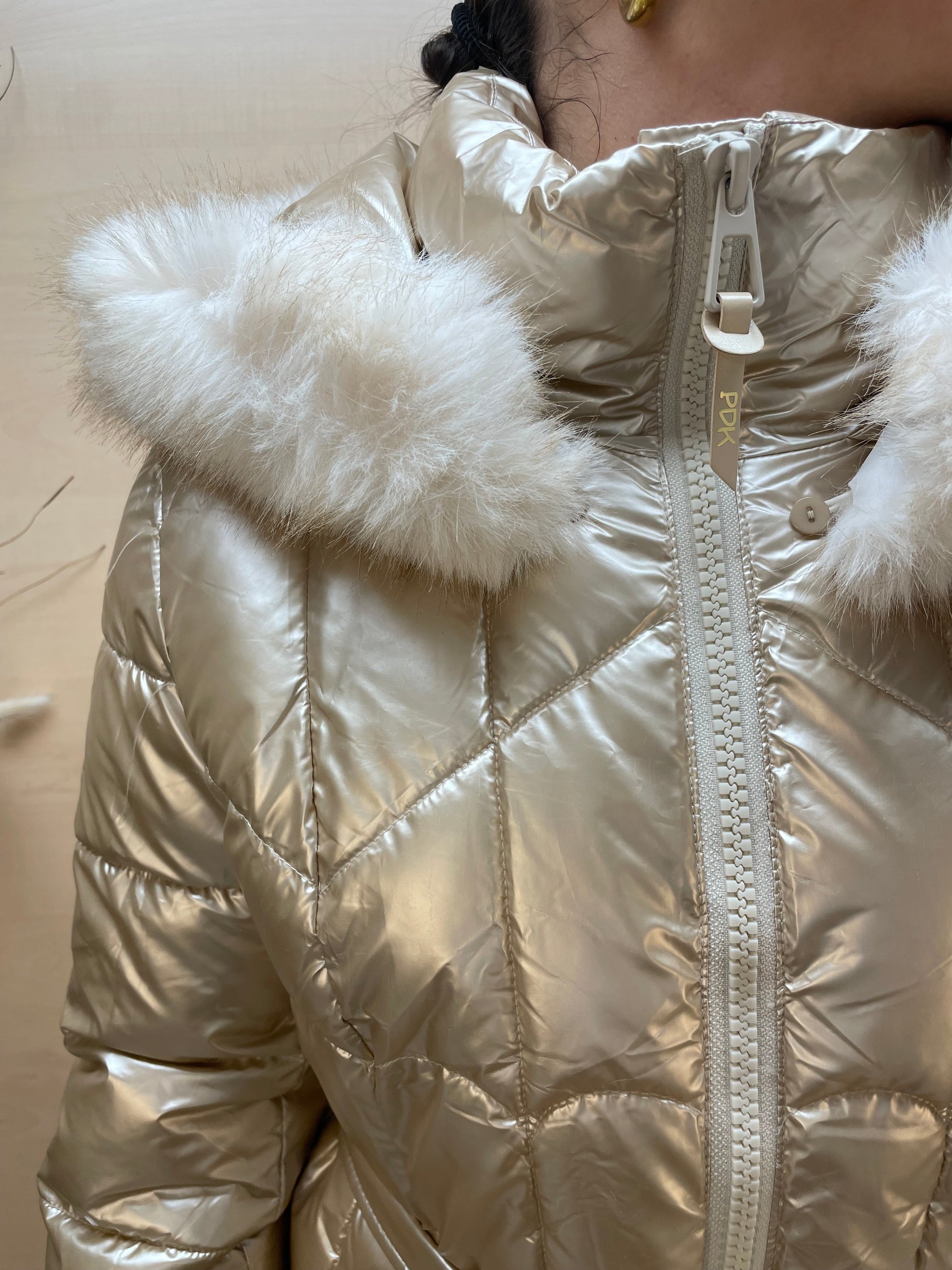 Il collo alto impreziosito da un morbido inserto in eco-pelliccia chiara aggiunge un dettaglio sofisticato e garantisce maggiore protezione dal freddo. La pratica chiusura frontale con zip lo rende comodo e versatile, perfetto sia per la quotidianità che per le occasioni più chic. Cappuccio rimovibile con zip. Bordo ecopelliccia rimovibile dal cappuccio .