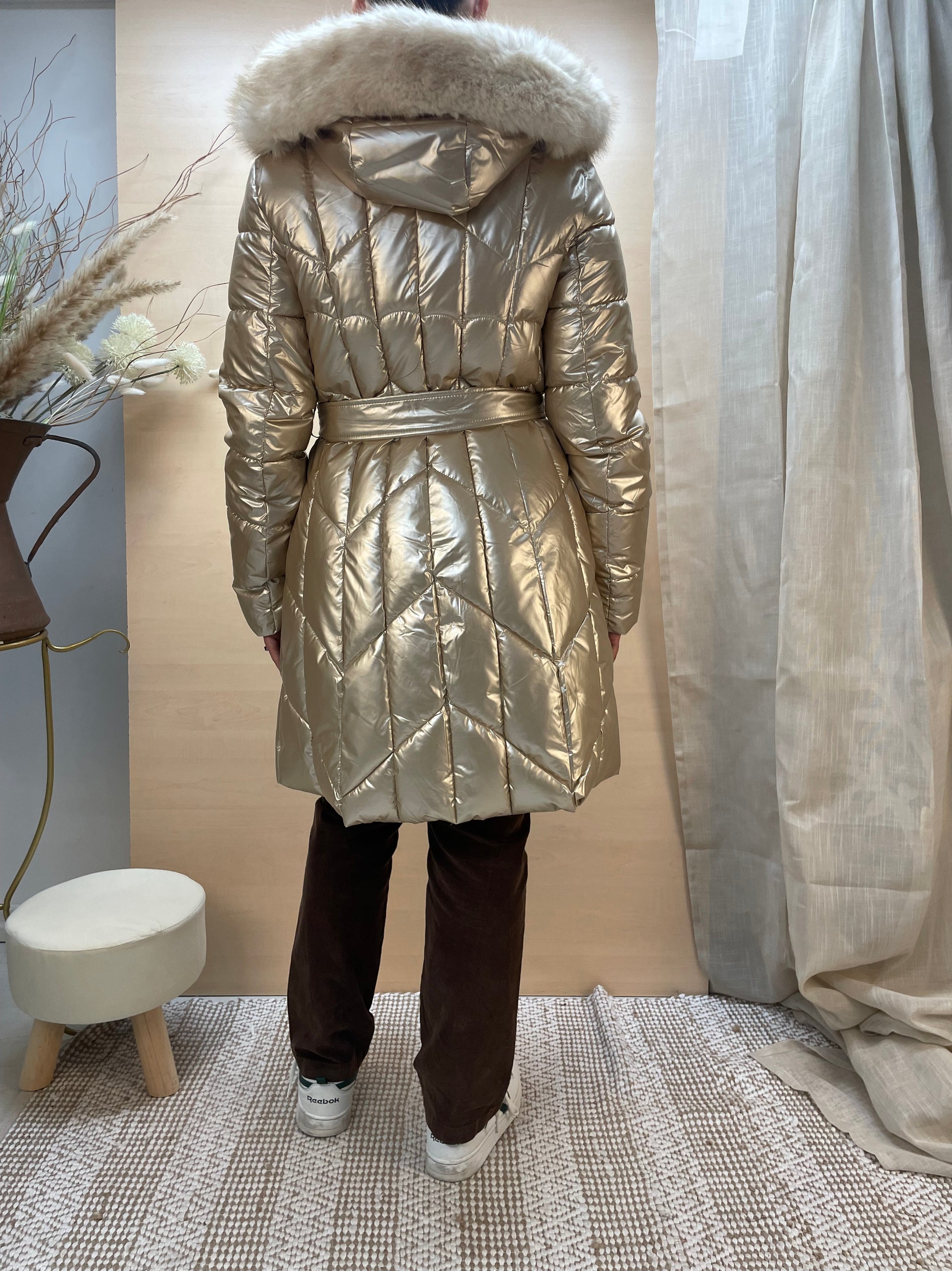 Piumino lungo color gold con cintura e cappuccio in eco-pelliccia