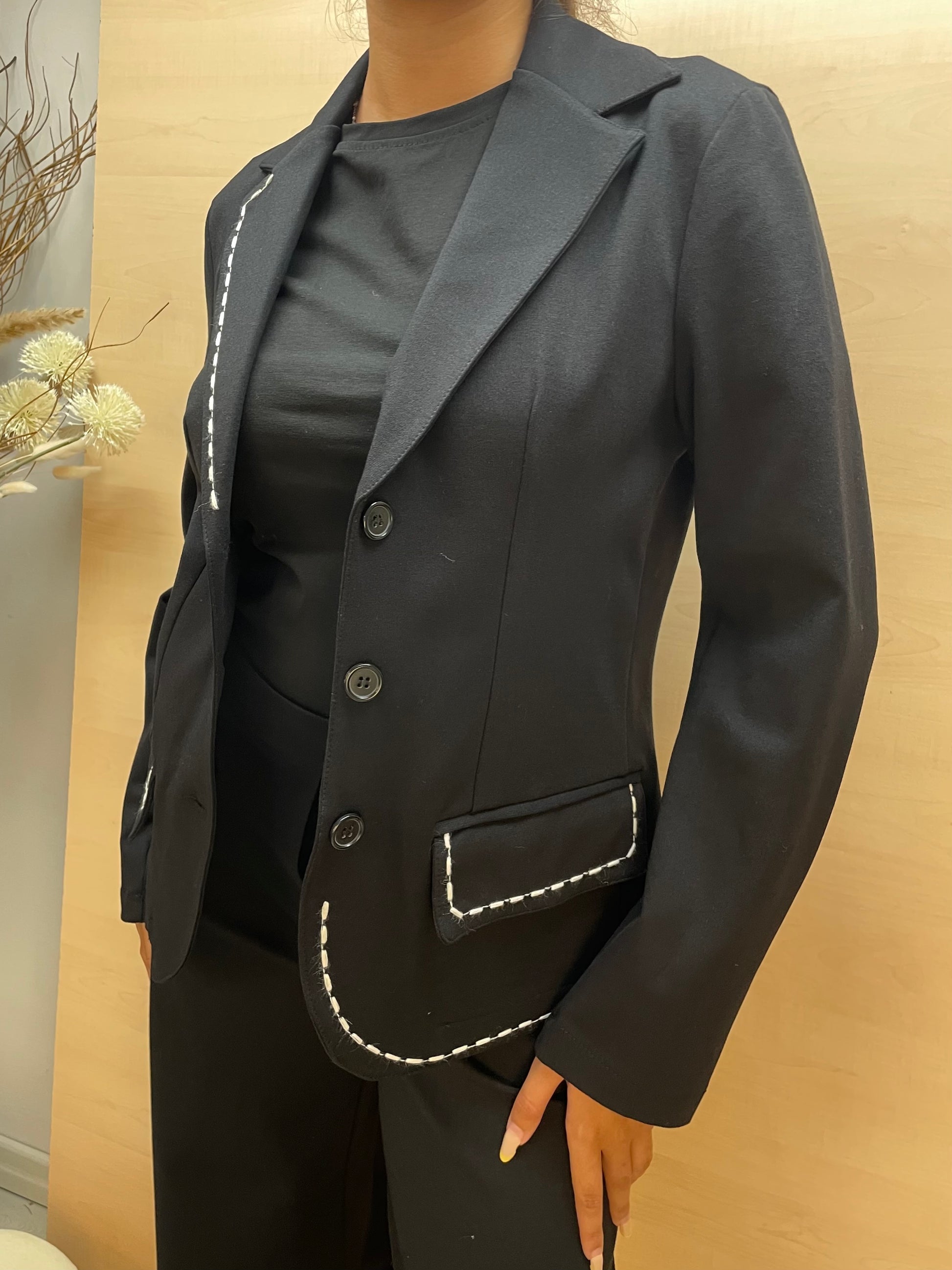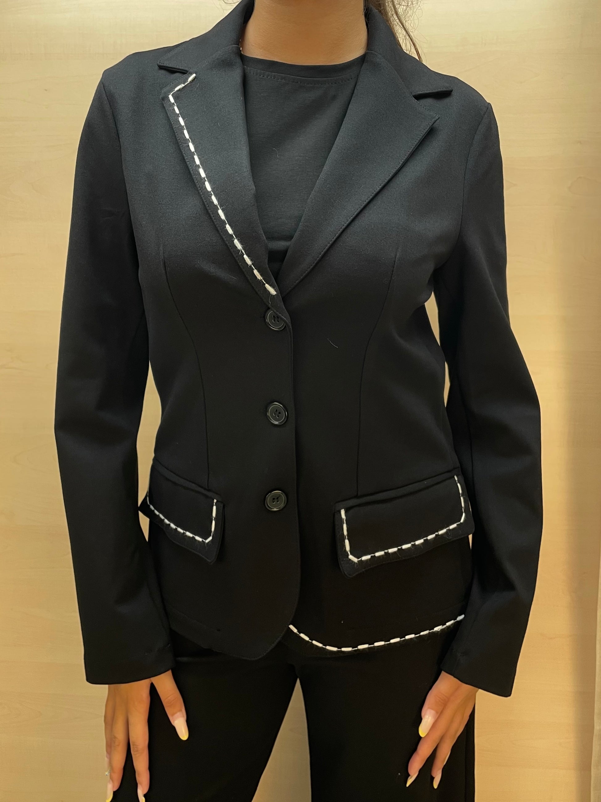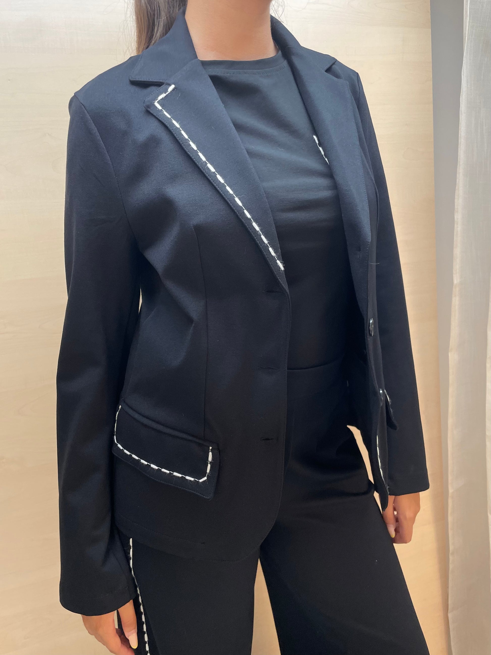A rendere il capo speciale sono i dettagli: piegoni bianchi applicati sulle tasche, a contrasto netto con la base nera, che donano ritmo e carattere al look senza perdere in eleganza. Un elemento grafico e raffinato, che rompe la simmetria con discrezione.
