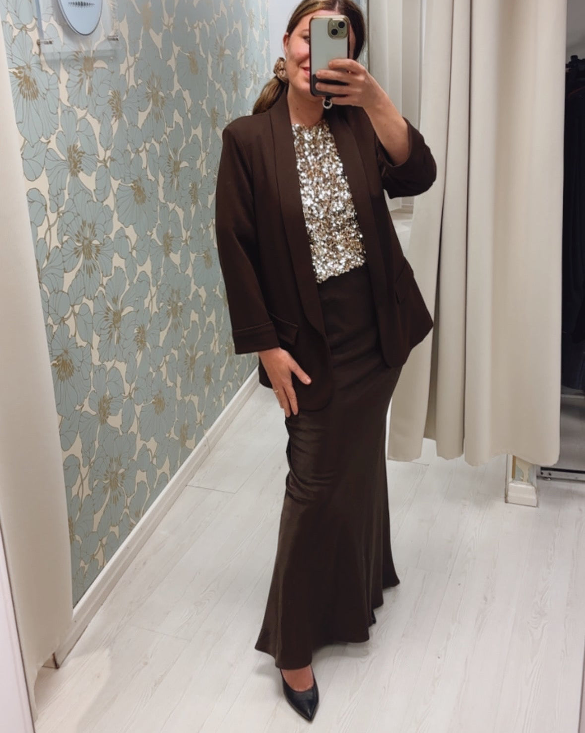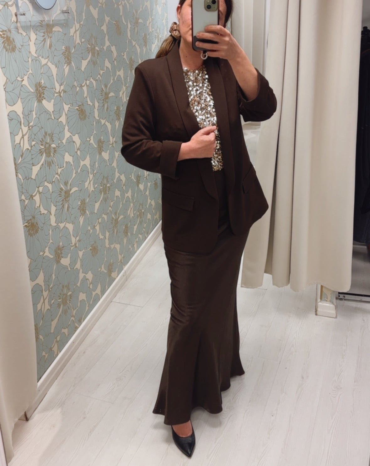 Una giacca fluida color moka, dal taglio morbido e senza bottoni, perfetta per accompagnare il movimento con naturalezza. Le maniche lunghe presentano dei risvolti discreti, che le conferiscono un dettaglio curato senza appesantire la linea. La sua versatilità la rende ideale sia in abbinamenti più sportivi, con jeans o pantaloni casual, sia in contesti più eleganti, indossata sopra un abito o con un pantalone classico. Un capo raffinato e contemporaneo, pensato per adattarsi a diversi momenti della giornata. In tessuto Jersey elasticizzata e sfoderata.