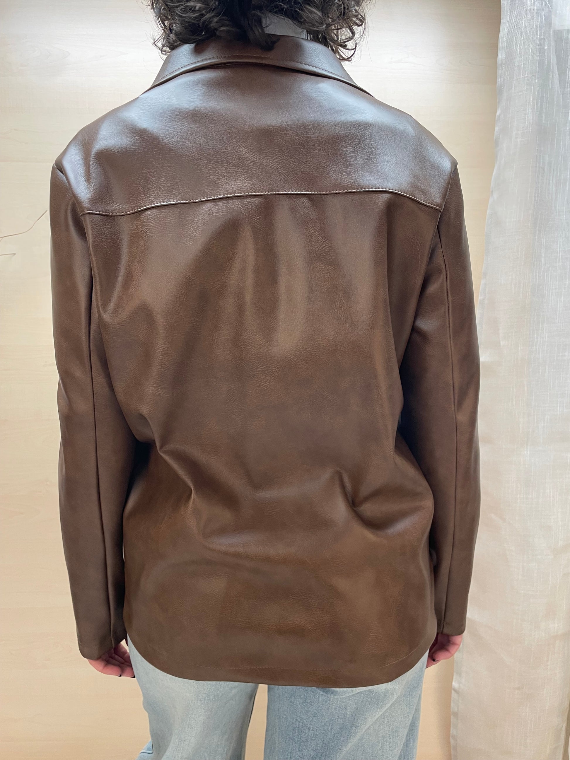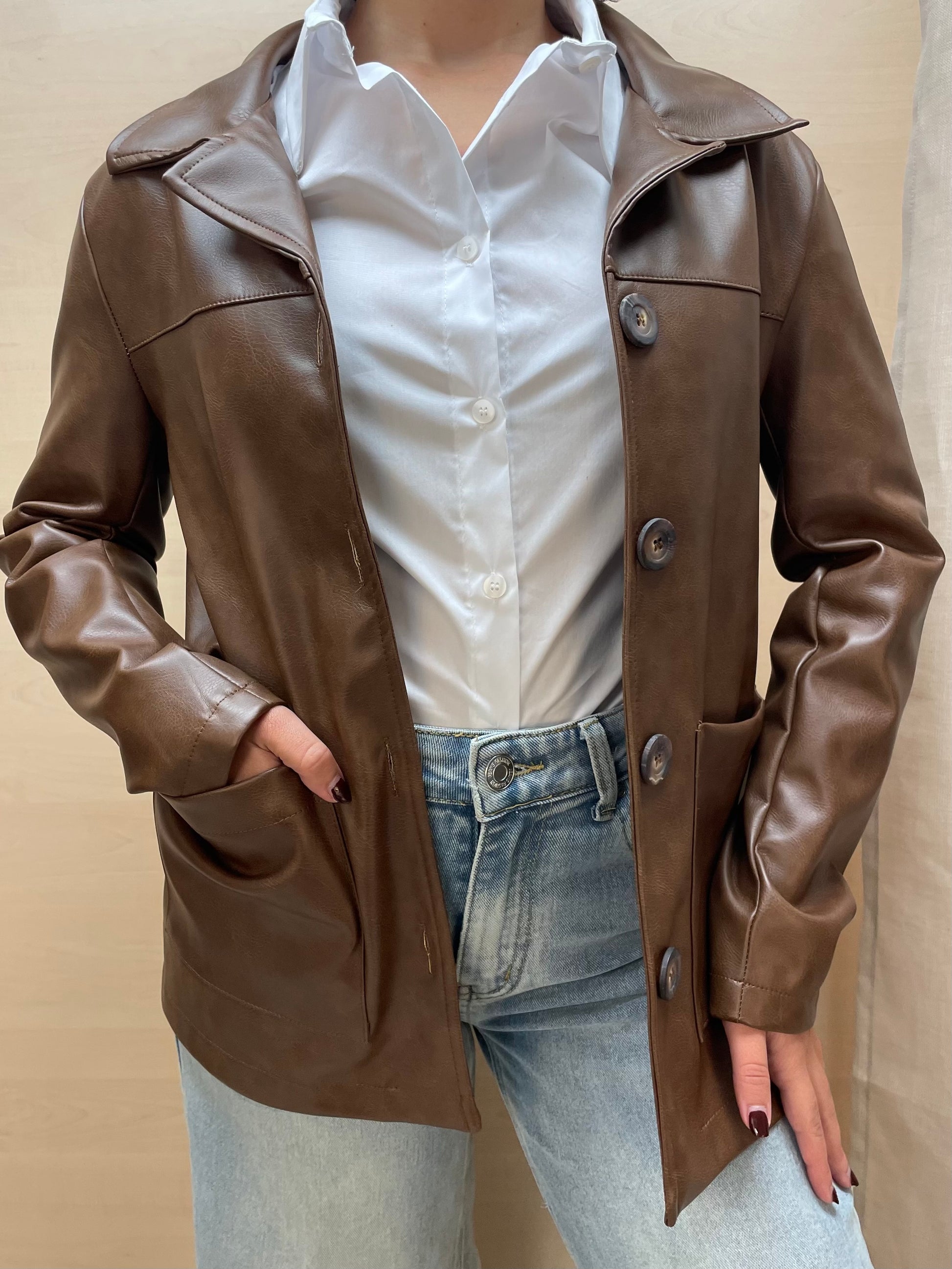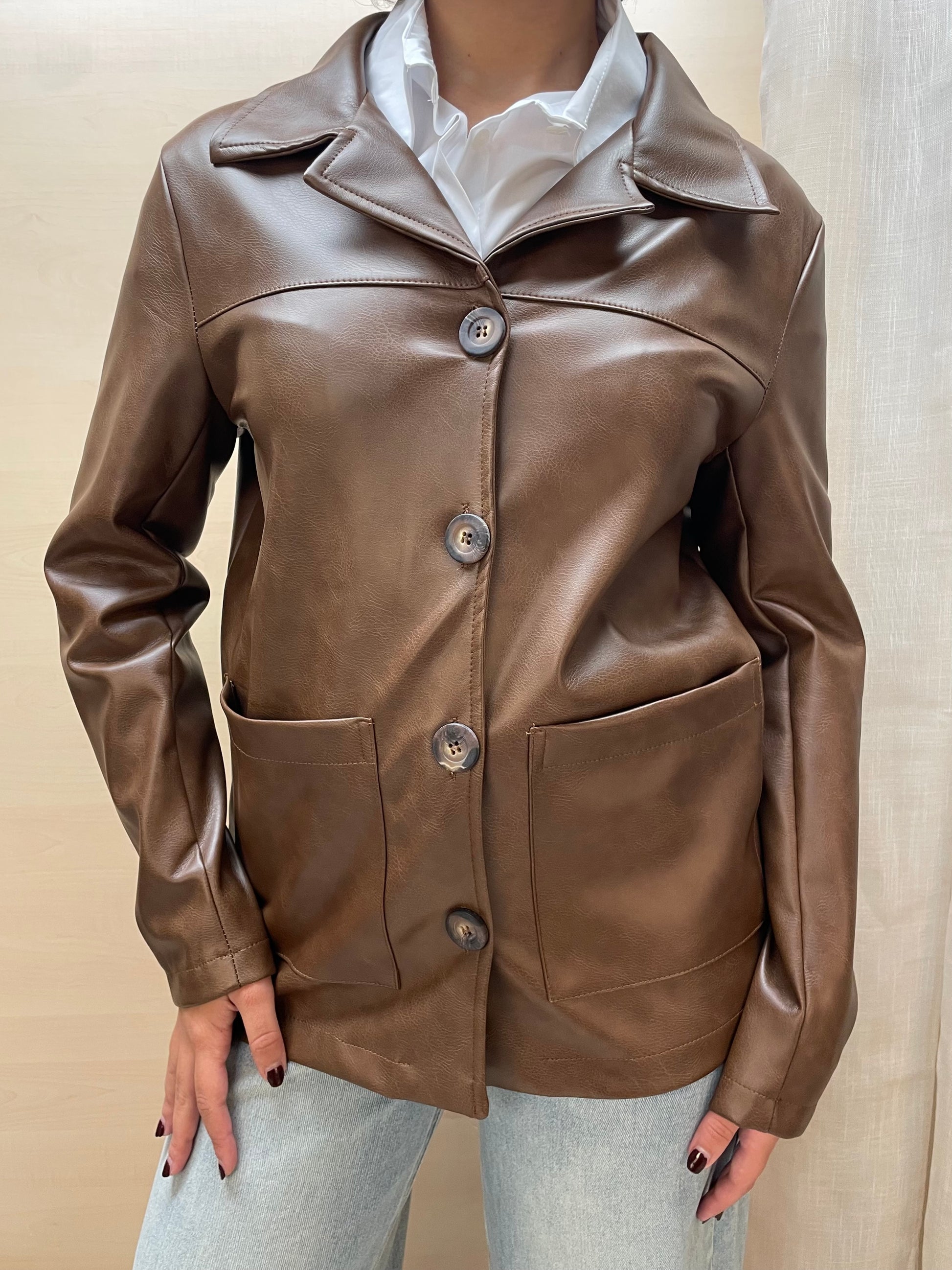 Un blazer dal fascino versatile, realizzato in ecopelle morbida all’esterno e con un interno dai toni caldi e avvolgenti che garantisce comfort e morbidezza.