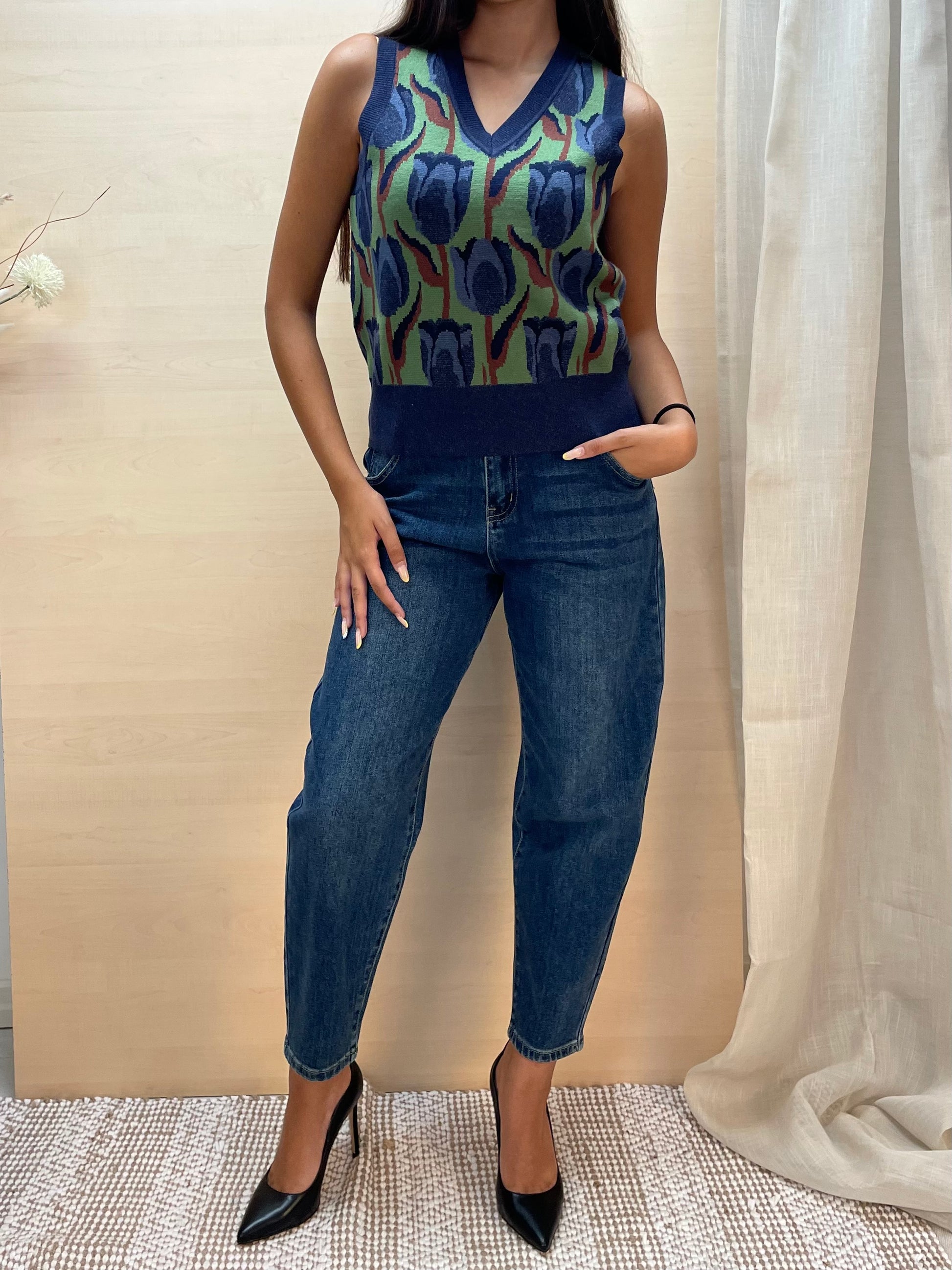 Gilet in jacquard, con una ricca lavorazione a tulipani che si sviluppa nei toni del blu, per un effetto grafico elegante ma contemporaneo. Il disegno è intrecciato direttamente nel tessuto, creando una superficie strutturata e piacevole al tatto.