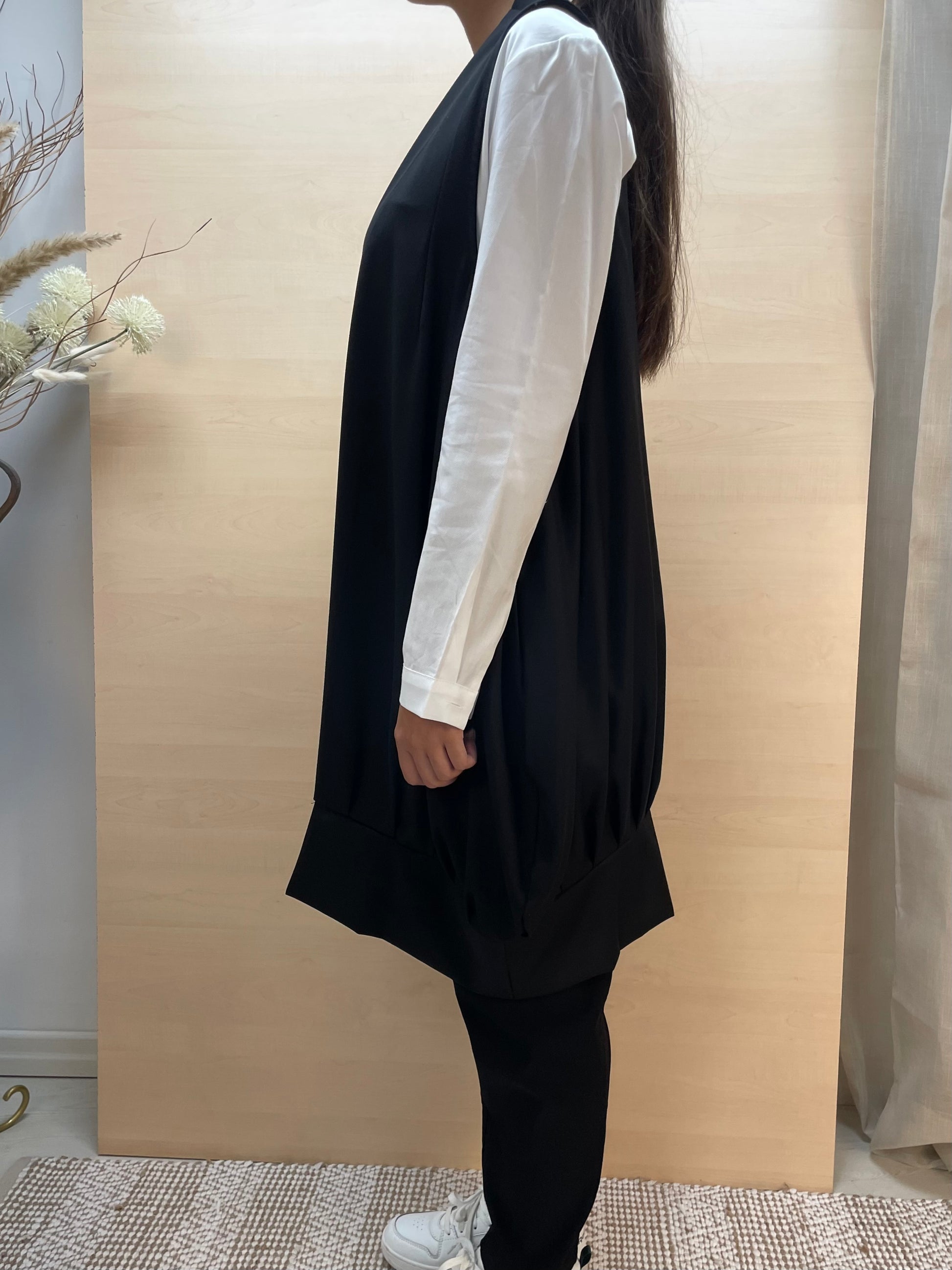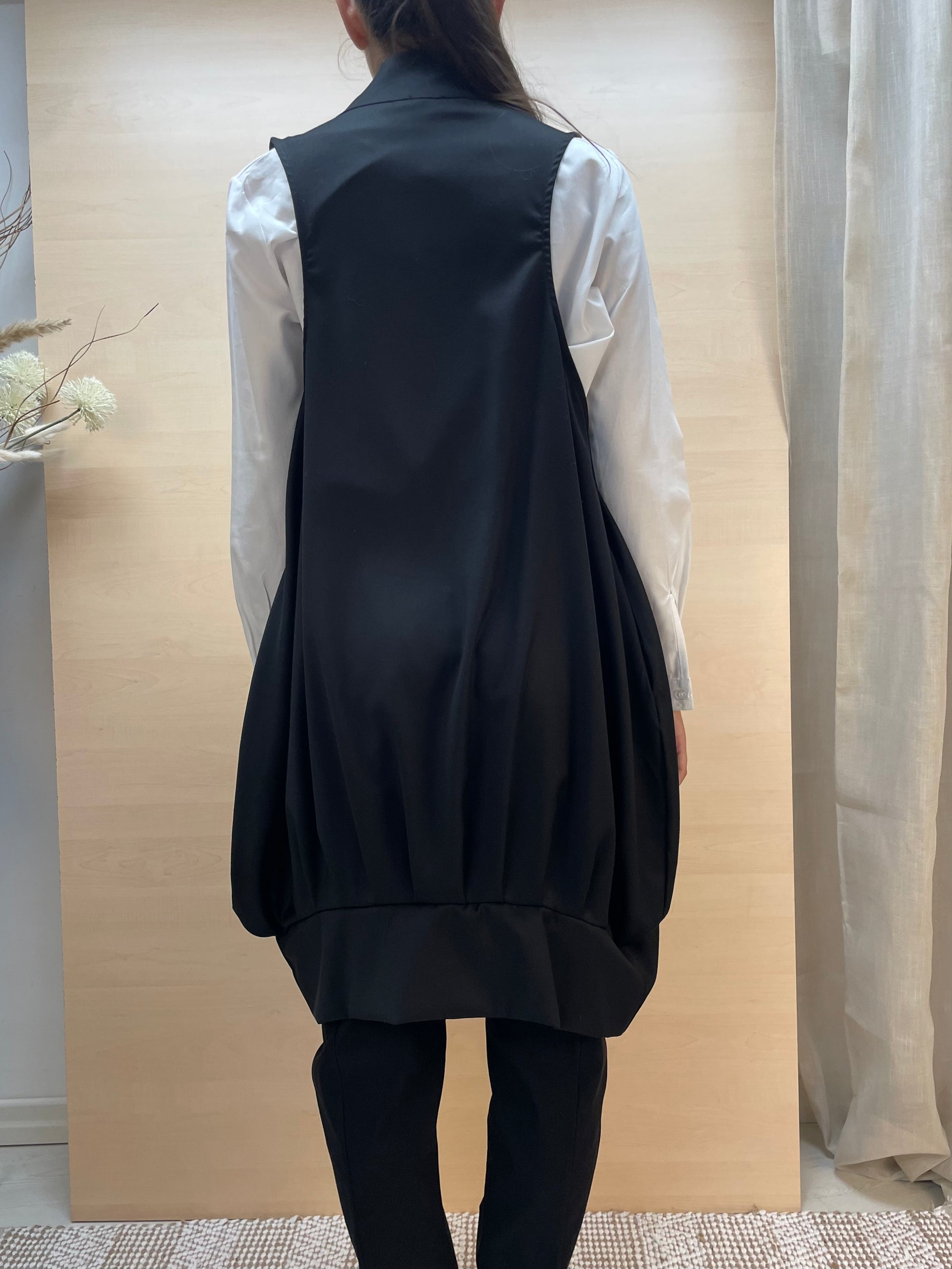 Gilet lungo in total black, realizzato in un tessuto morbido e confortevole al tatto, pensato per coniugare stile e funzionalità. La lunghezza sfiora il ginocchio, con una linea leggermente a palloncino sul fondo che si restringe delicatamente, creando una silhouette dinamica ma equilibrata.
