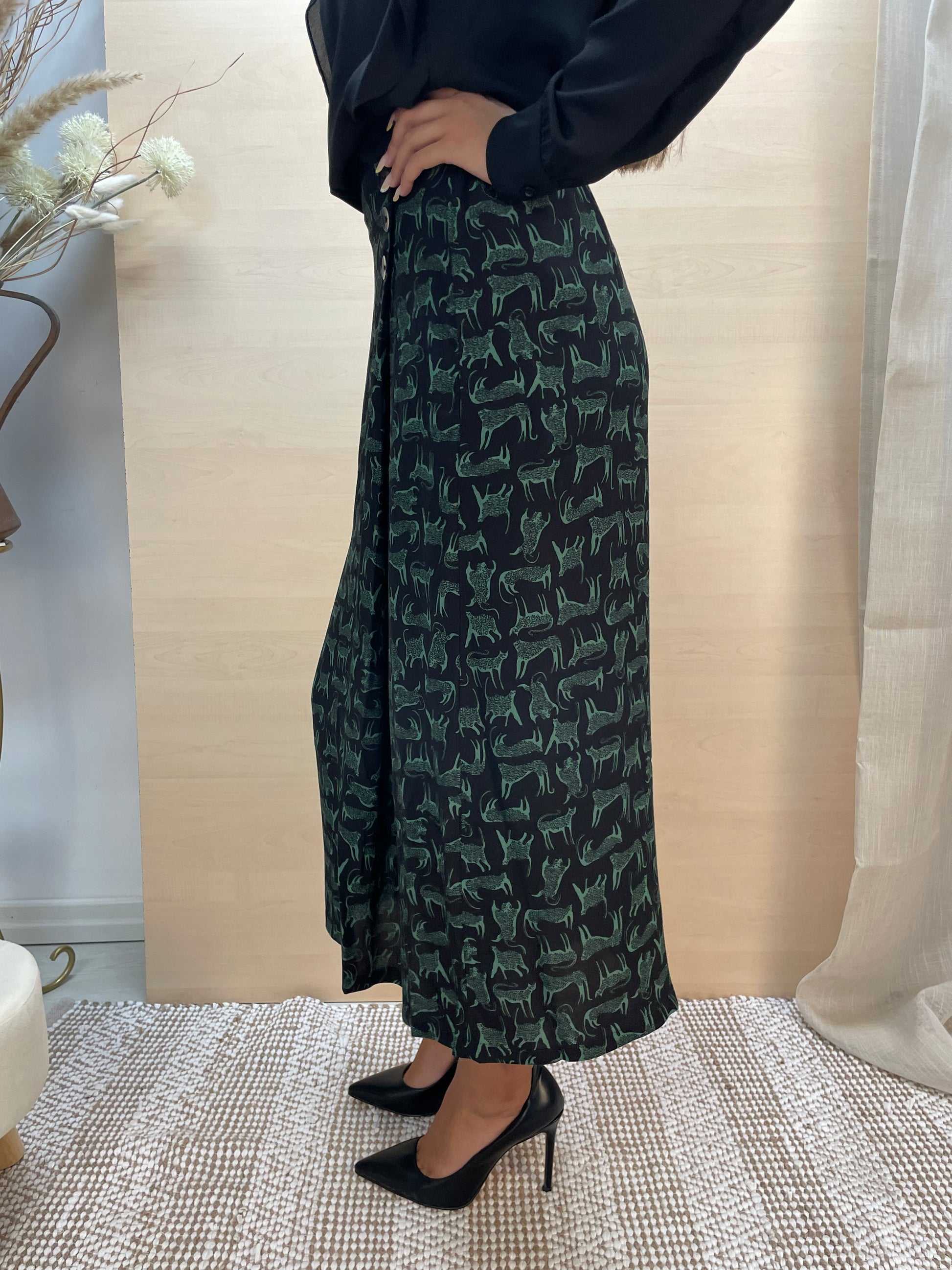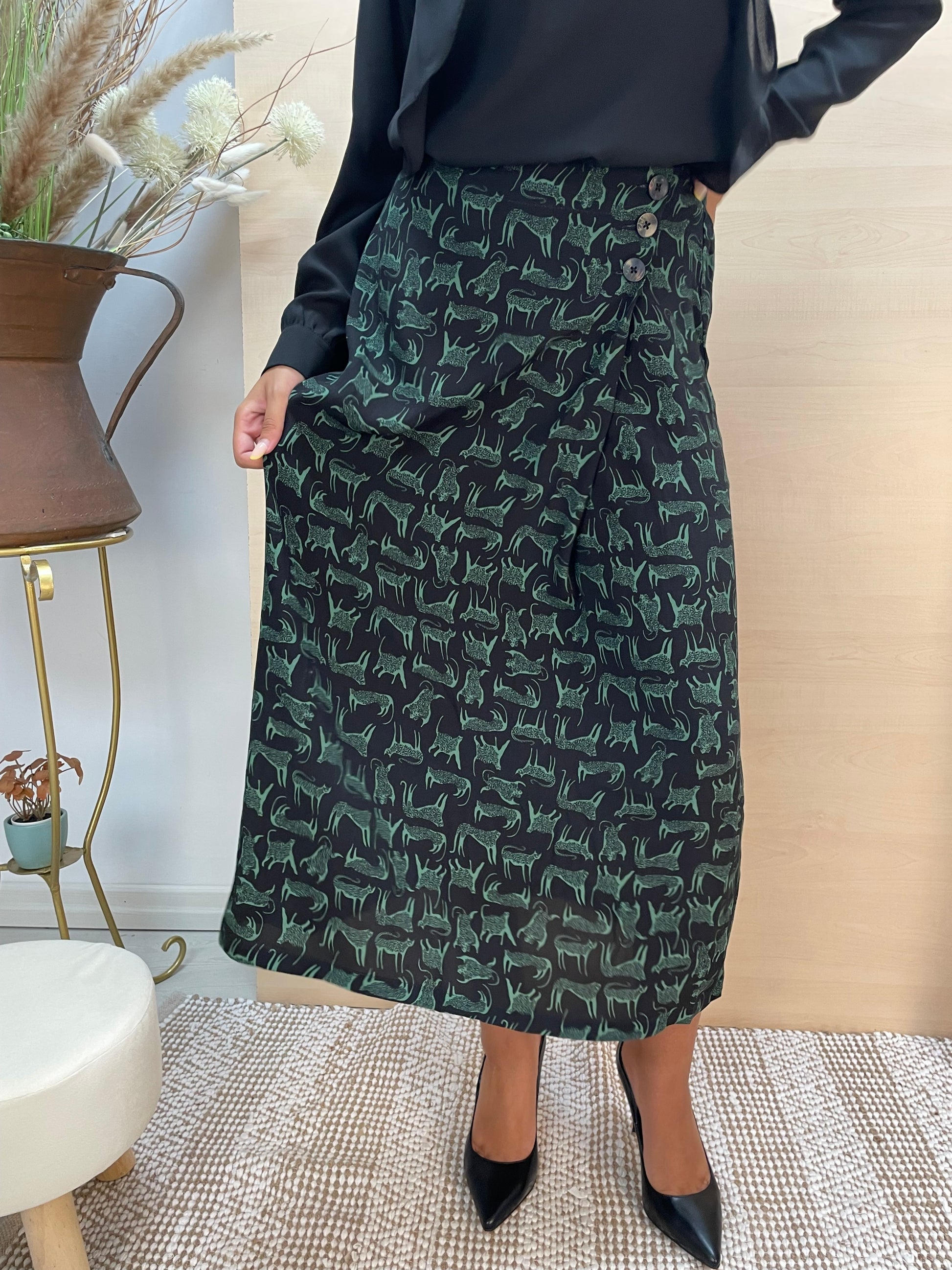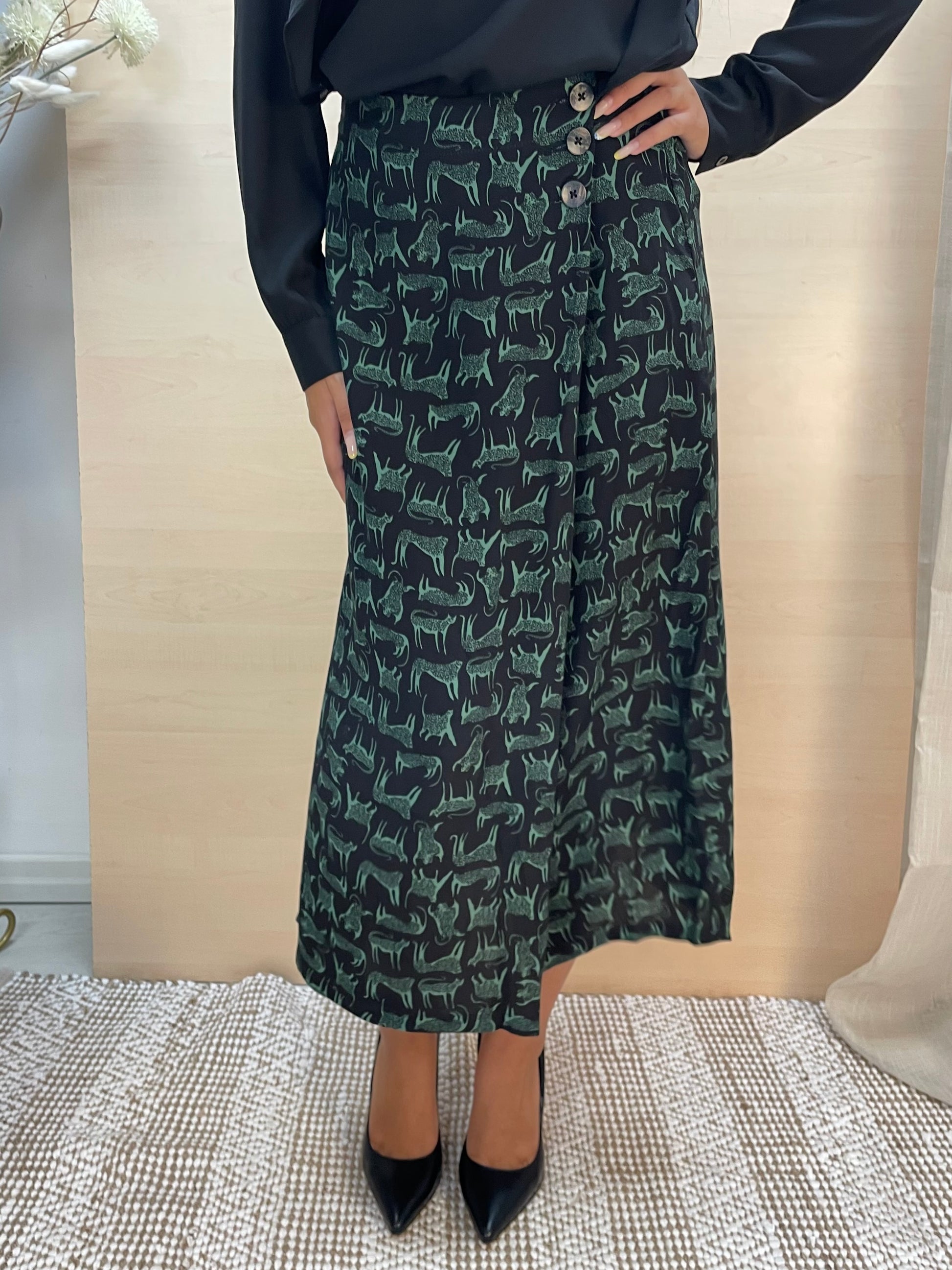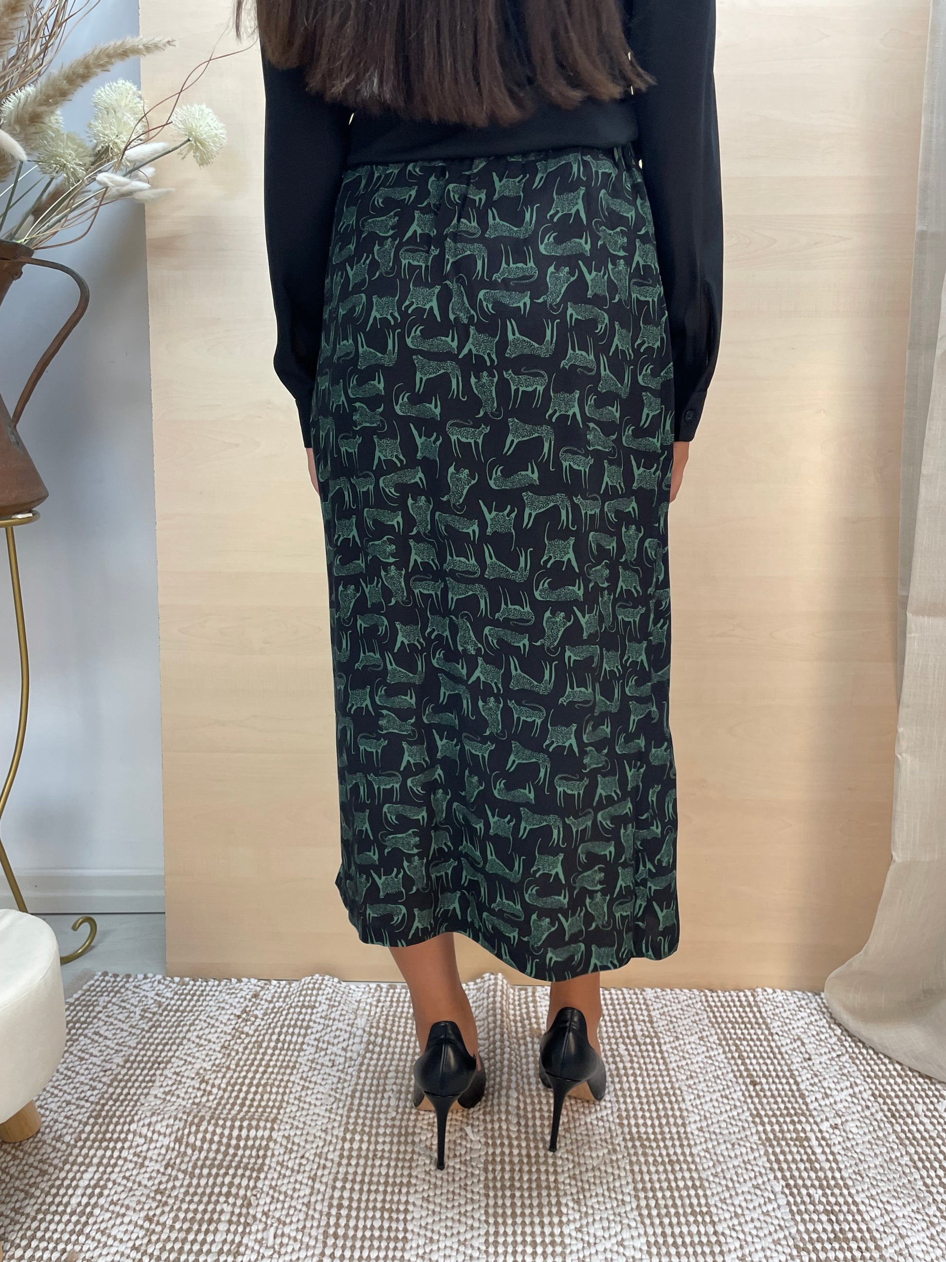 Gonna in 100% viscosa, con base nera e una dinamica stampa animalier felina nei toni del verde, per un effetto grafico deciso ma femminile.