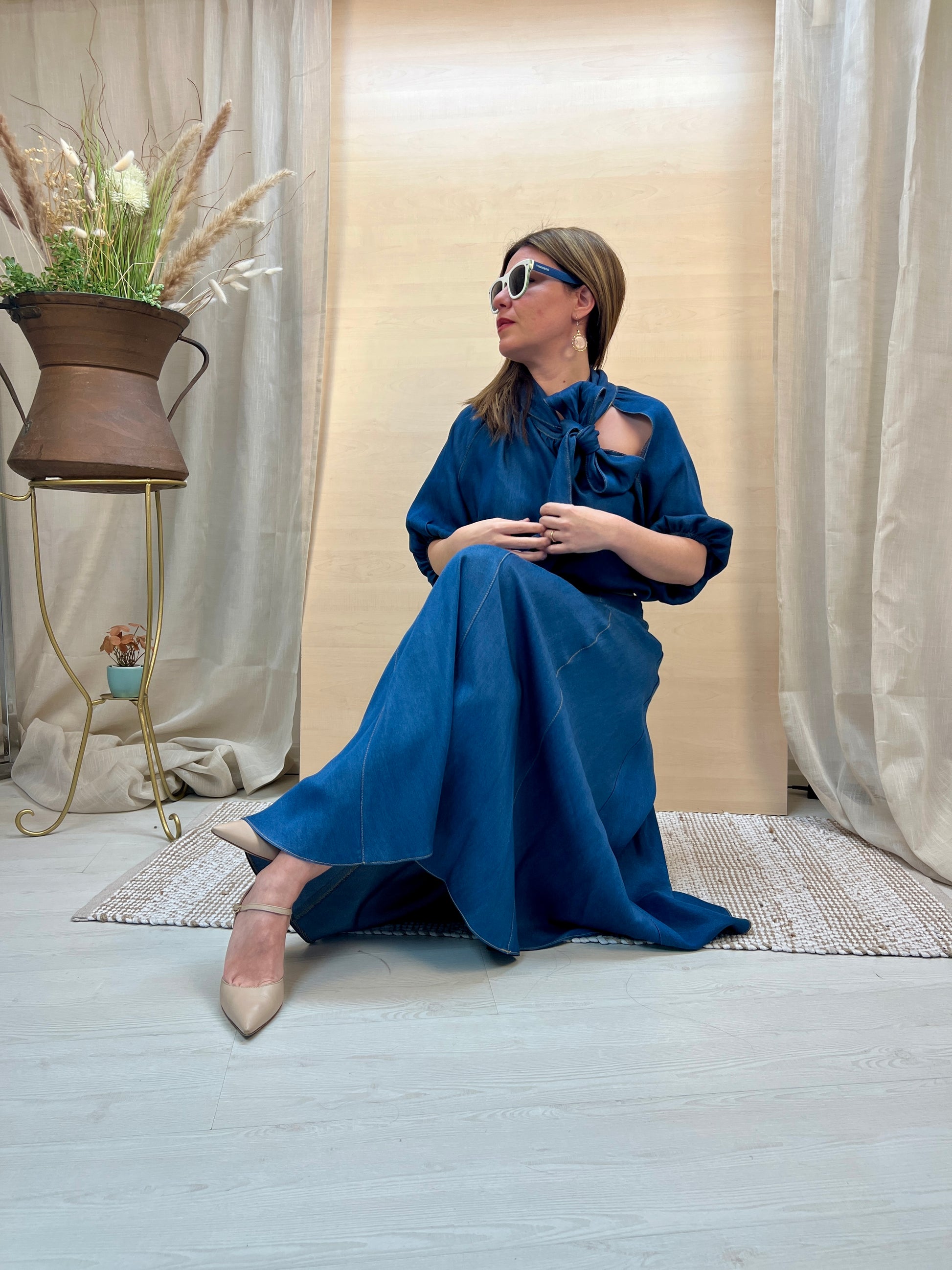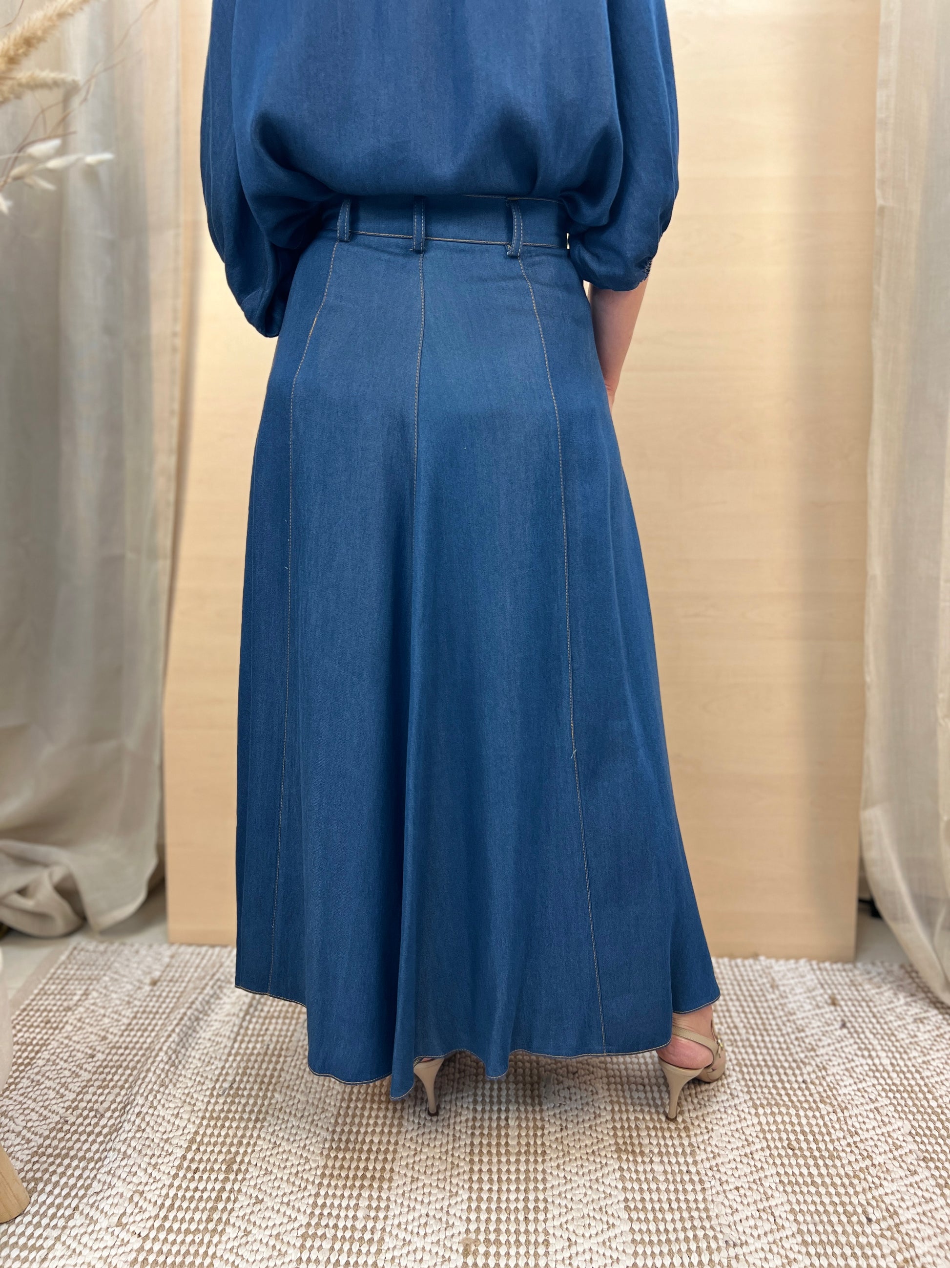Gonna lunga donna PHARD in denim chambray 100% Tencel, blu denim medio, dalla linea ampia e fluida.