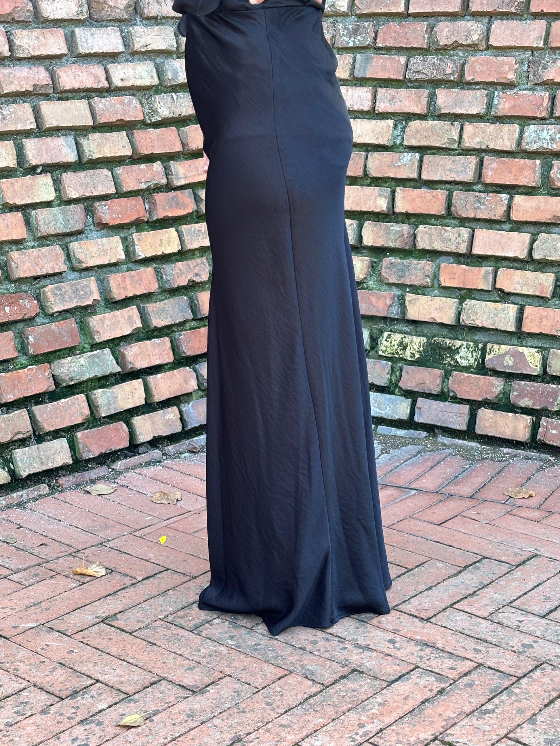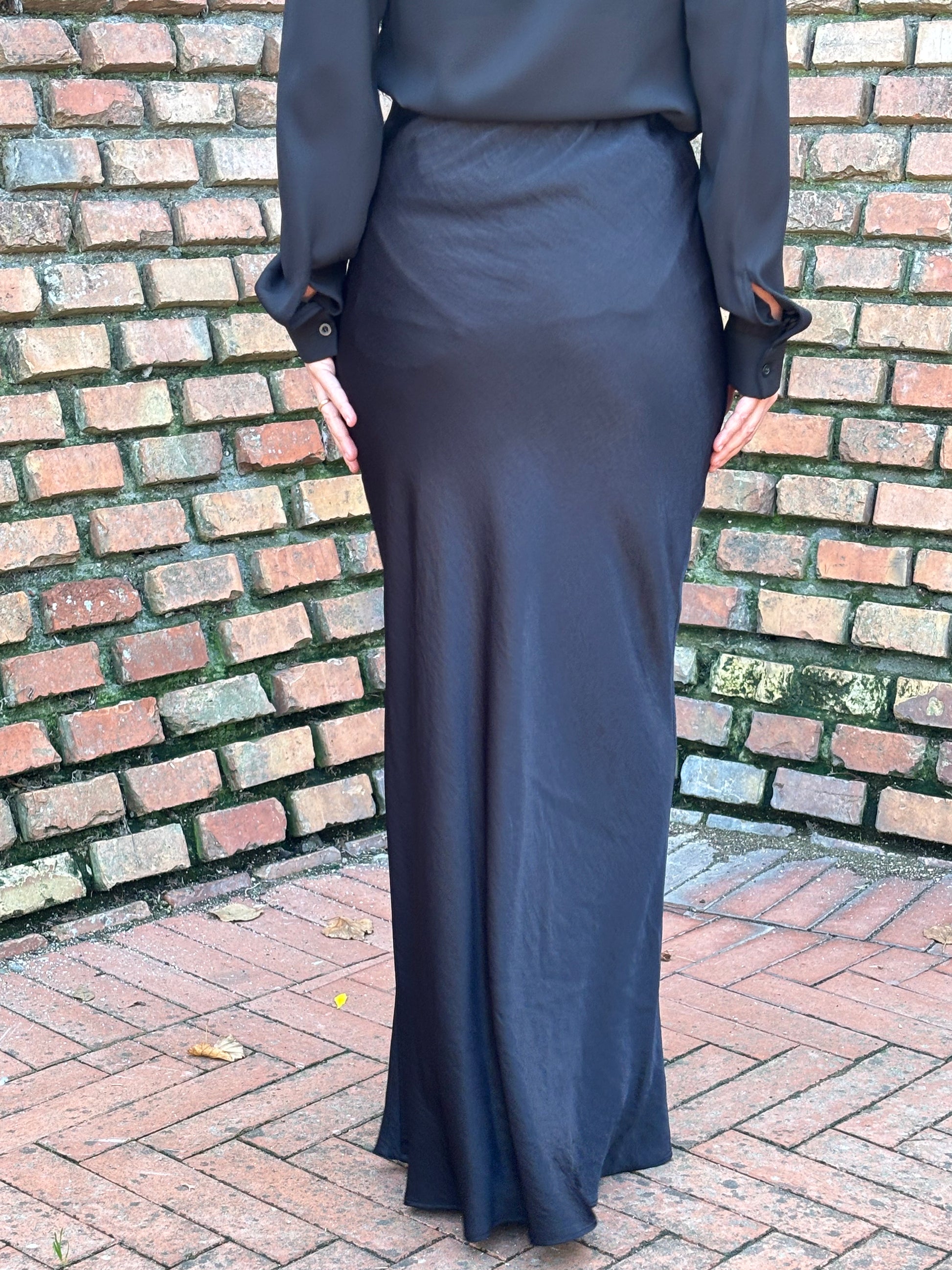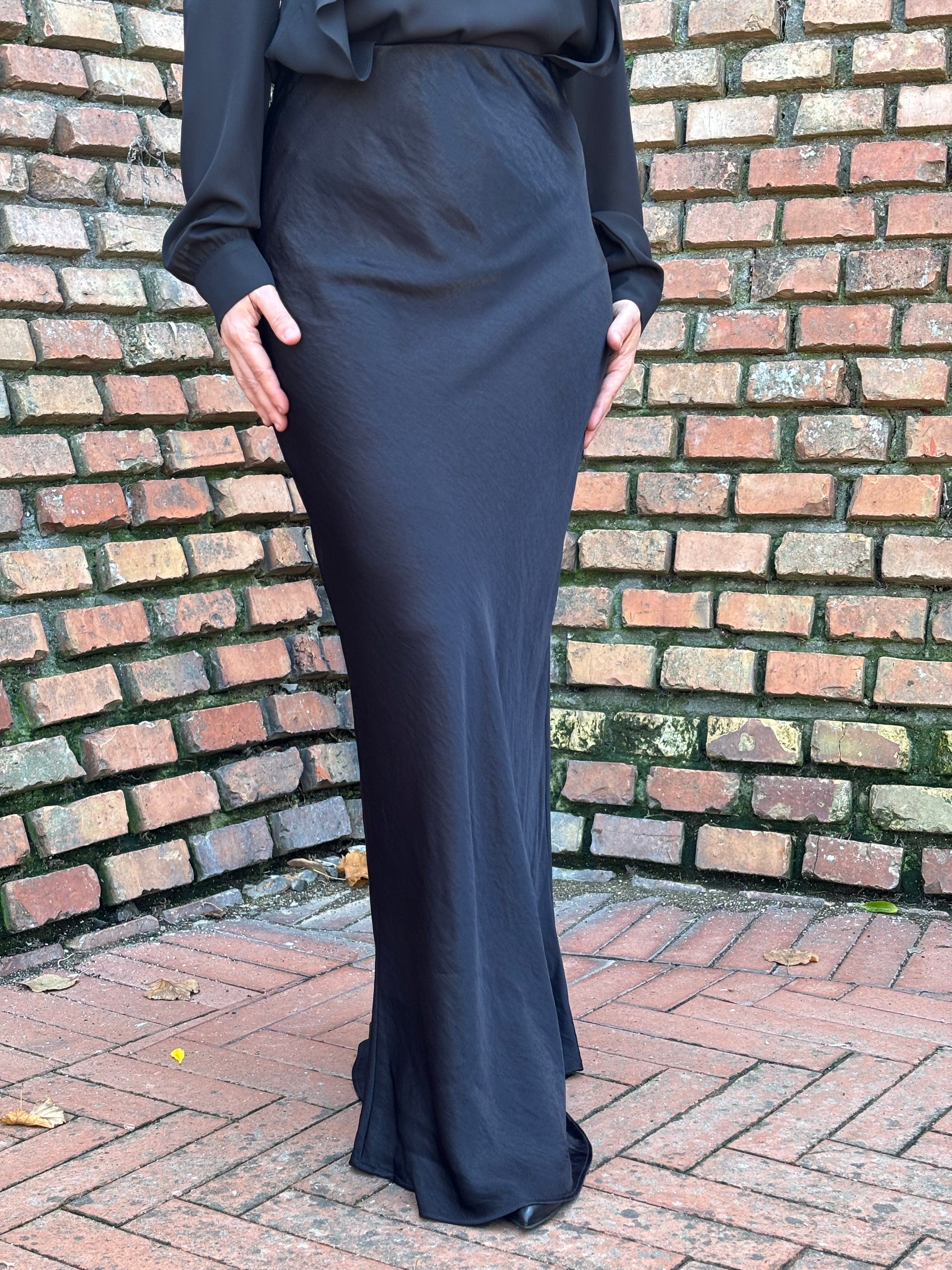Elegante e sensuale, questa gonna lunga a sirena in raso color nero è un capo che unisce raffinatezza e comfort. Realizzata in sbieco, segue le linee del corpo con naturalezza senza stringere, valorizzando la silhouette con una vestibilità comoda e fluida.