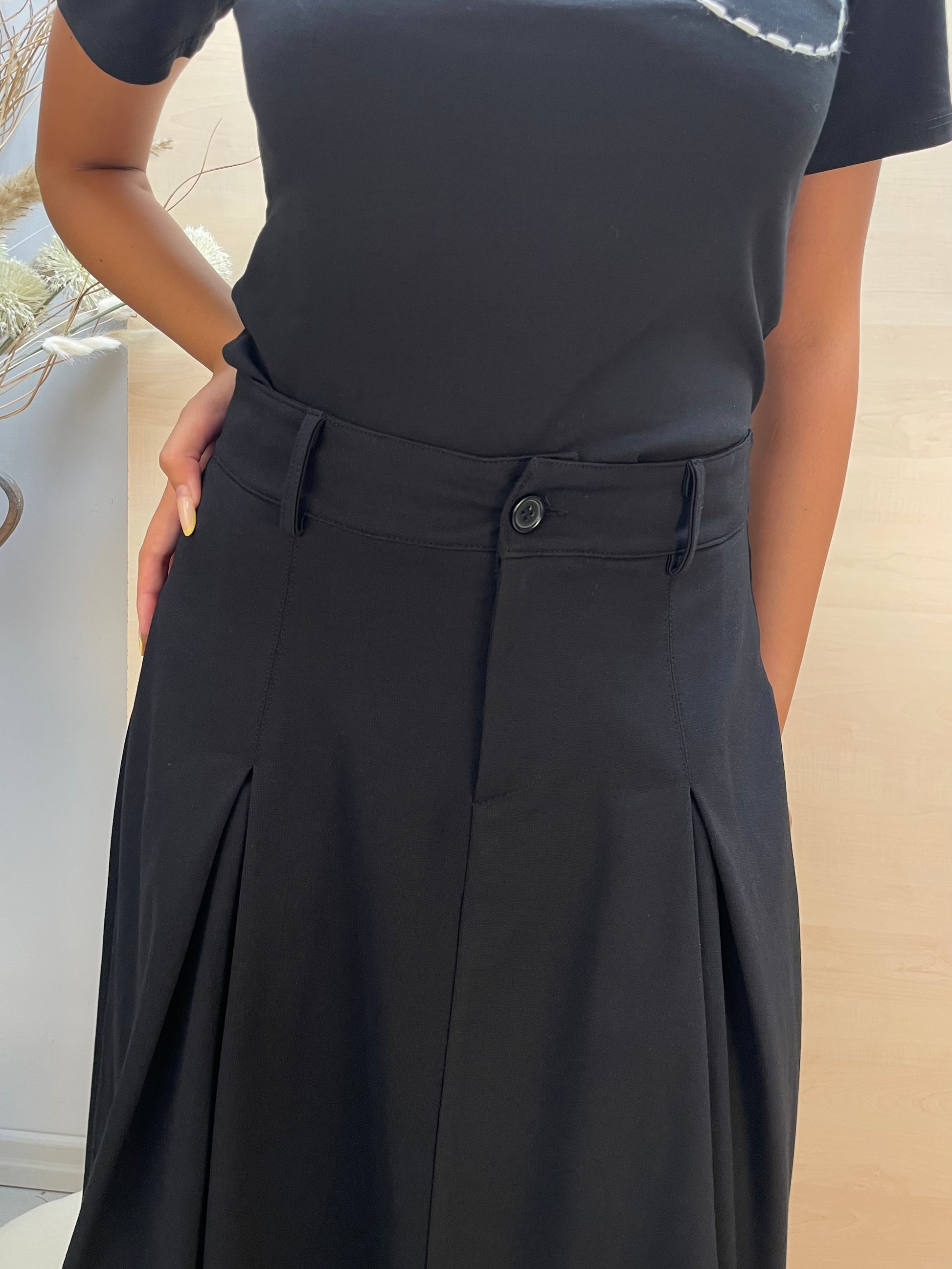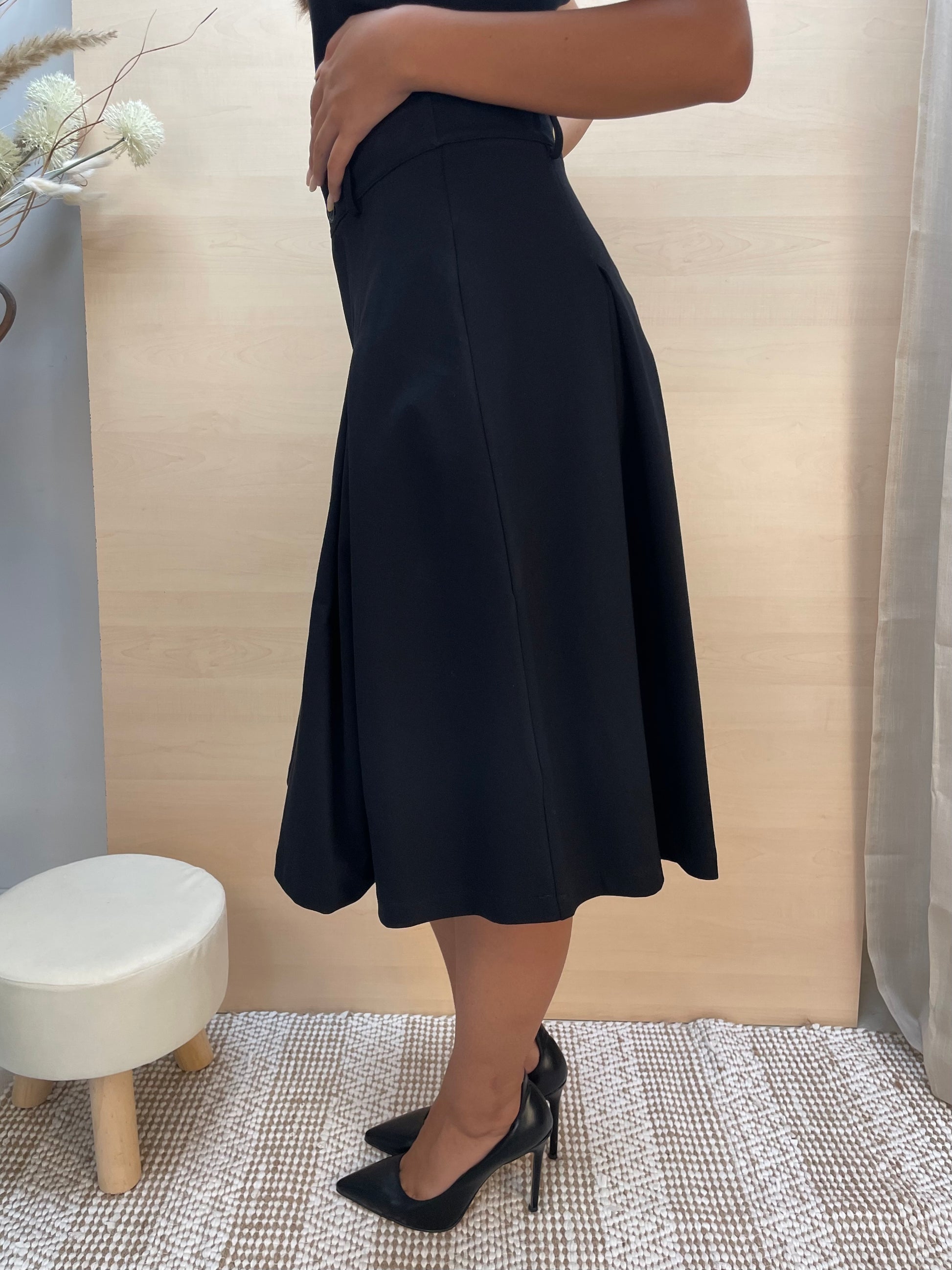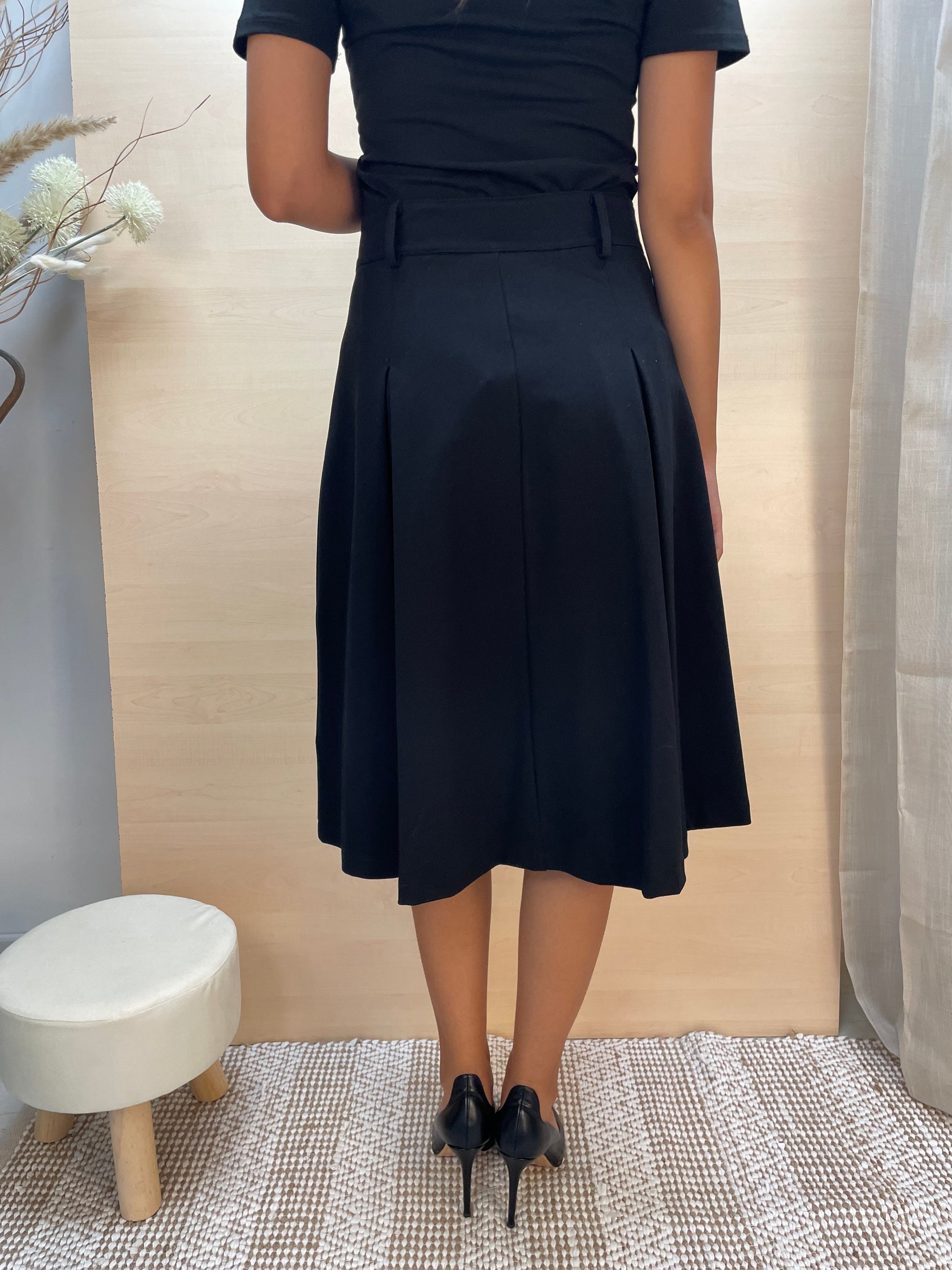Realizzata in un punto Milano morbido e compatto, questa gonna nera è pensata per accompagnare la figura con eleganza senza costrizioni. La linea è ampia, movimentata da pieghe morbide, che donano volume e dinamismo al capo senza appesantirlo.