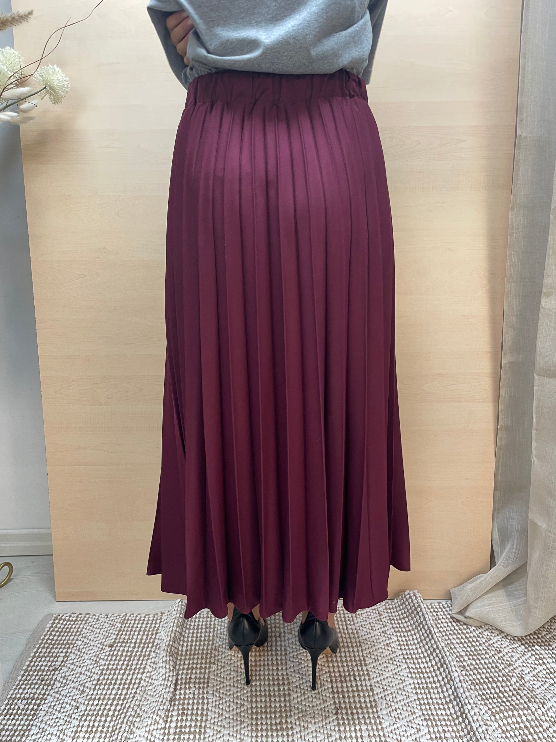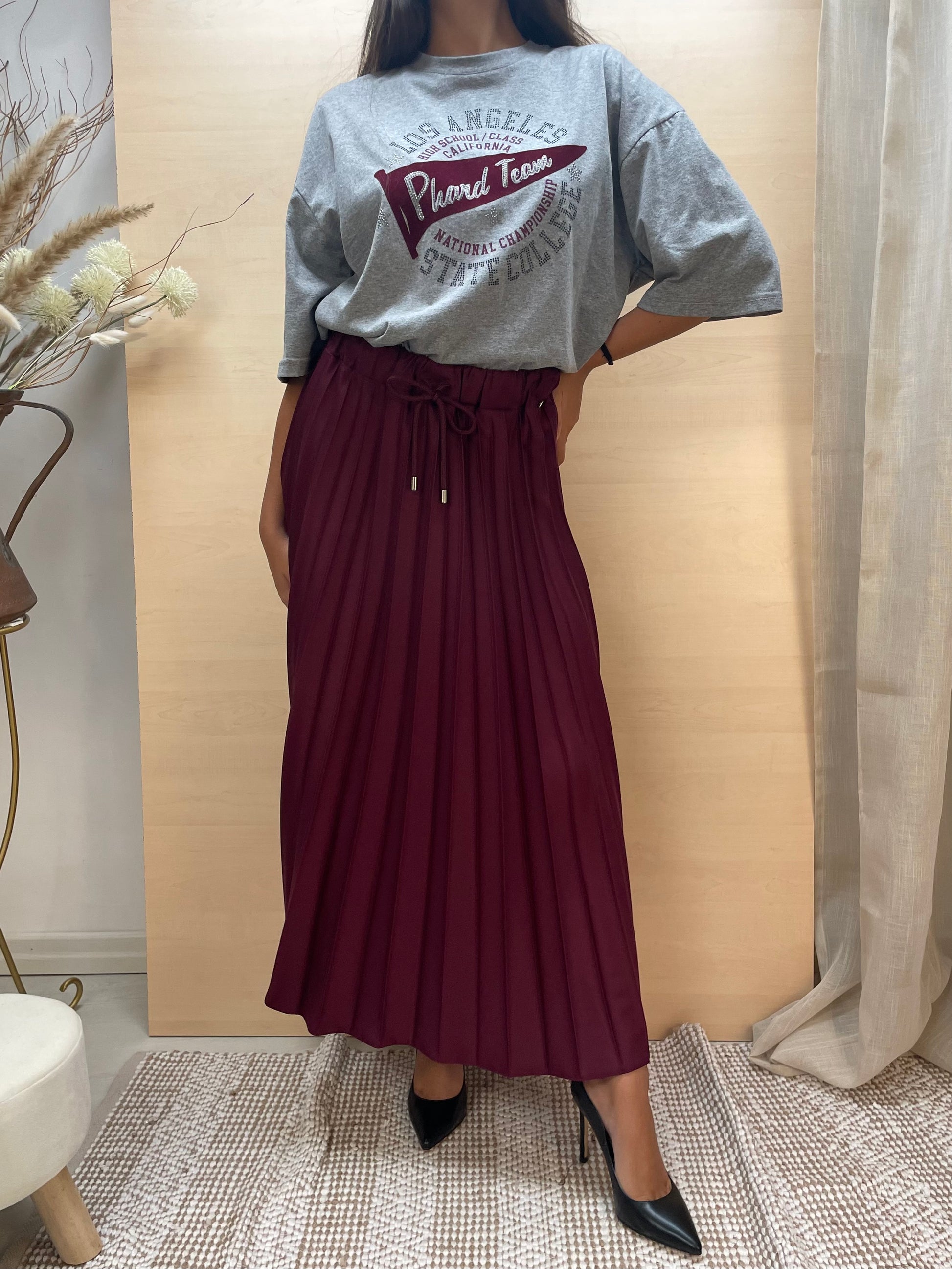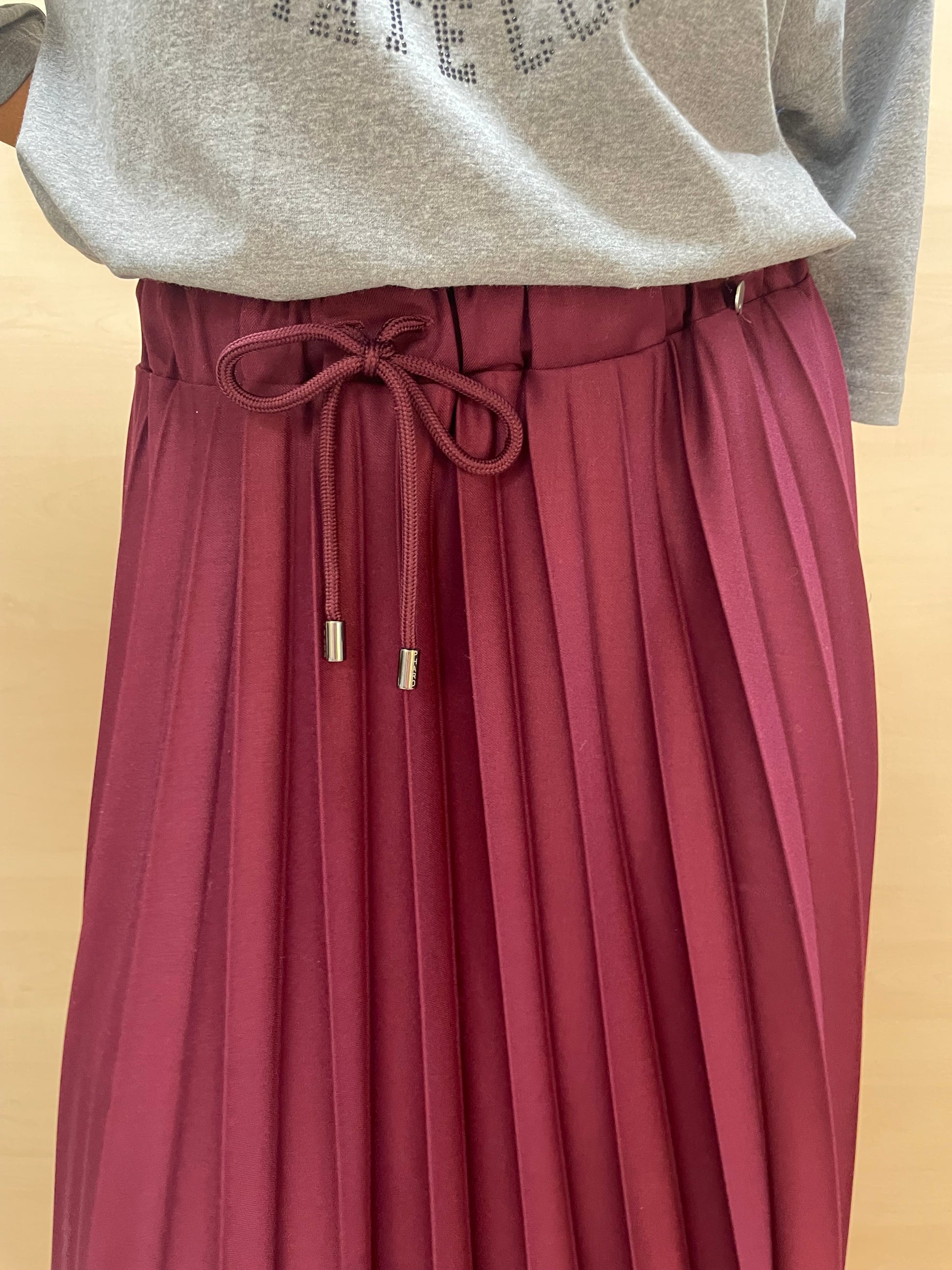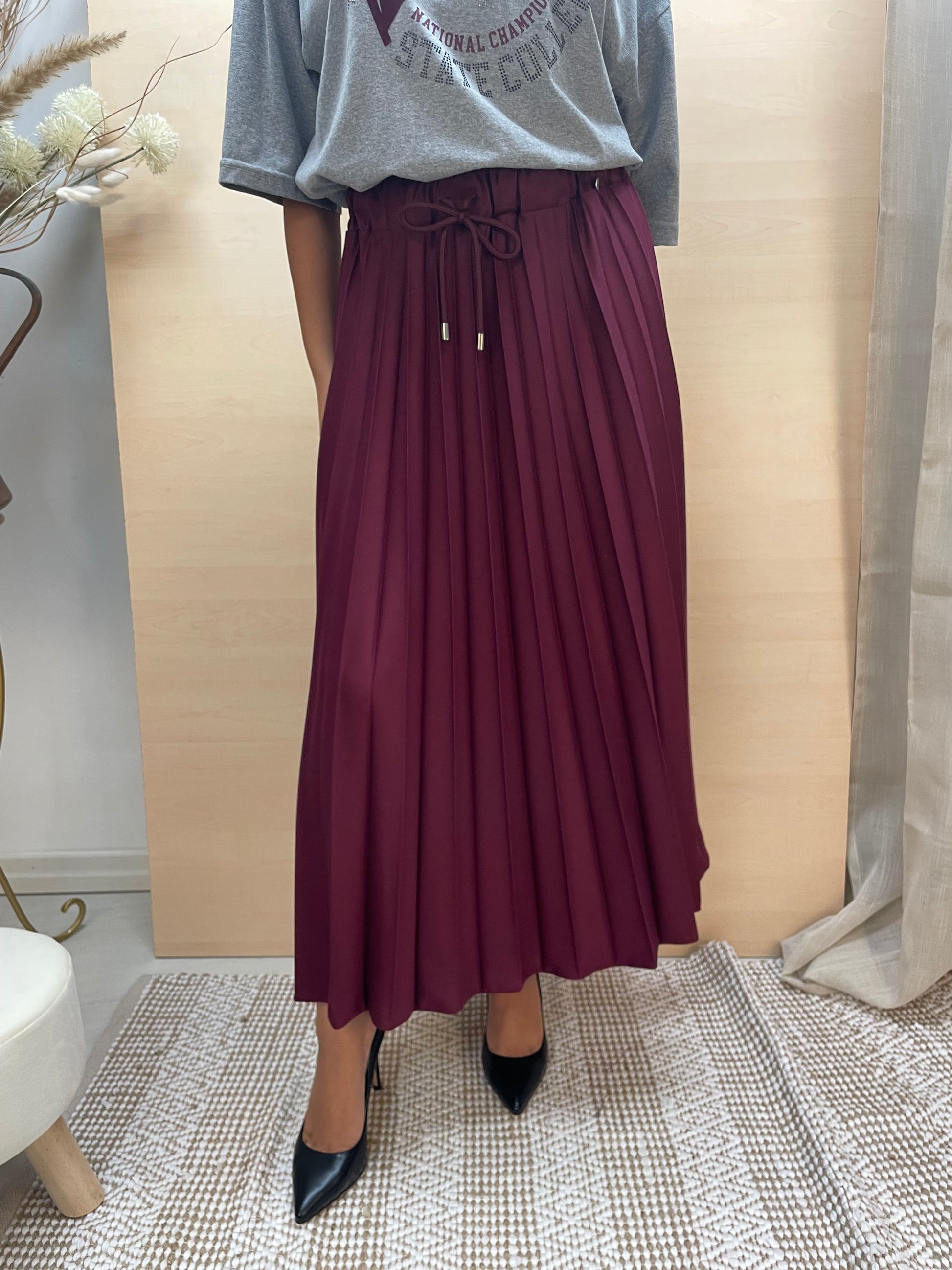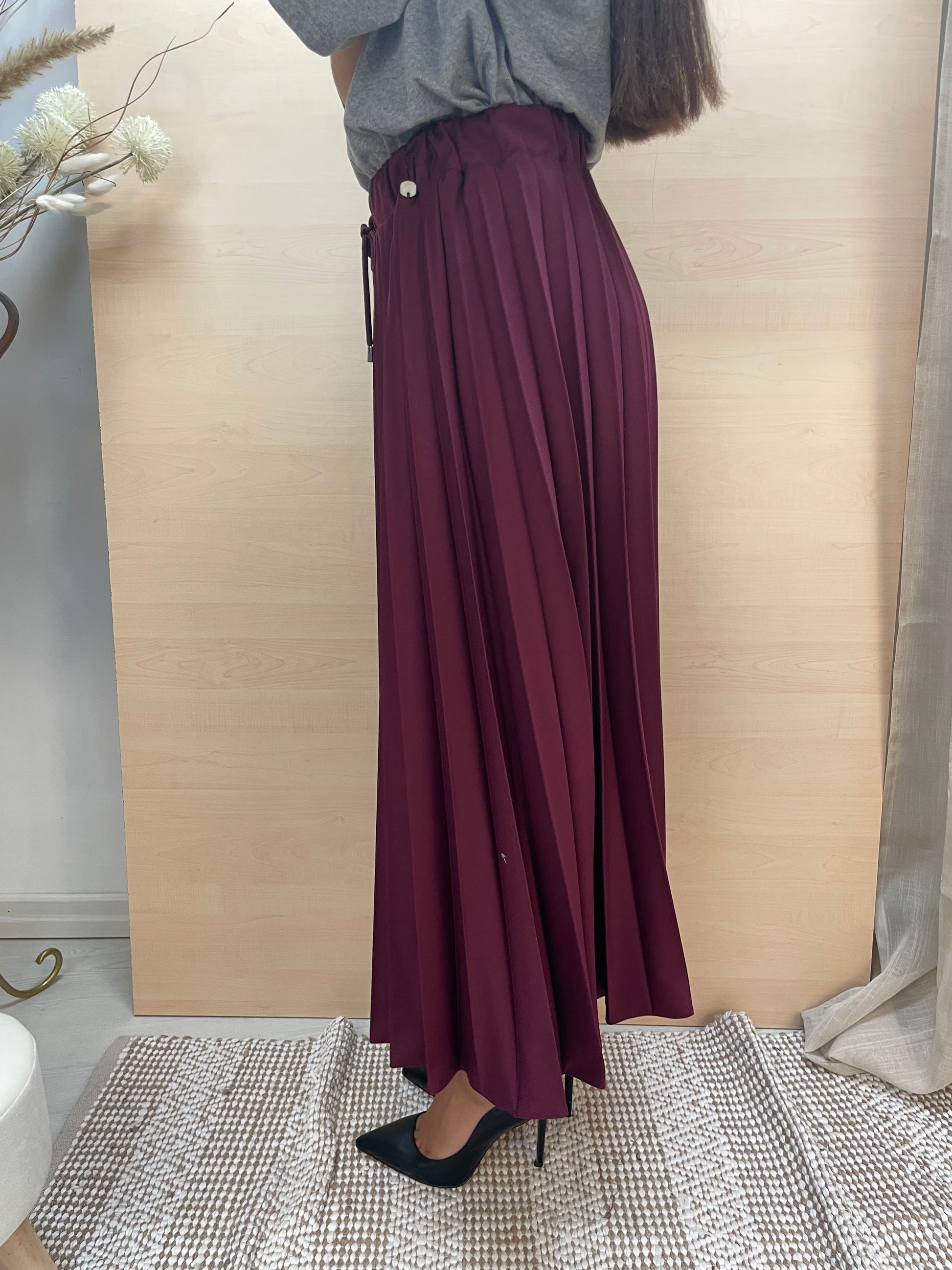 Gonna lunga fino alla caviglia in tessuto grigio, caratterizzata da una lavorazione plissettata che dona movimento e leggerezza. La vita è elasticizzata con fascia a molla e completata da un laccio regolabile che permette di adattare la misura in base alle proprie esigenze. Un capo estremamente versatile: abbinata a una t-shirt e sneakers regala un look sportivo e disinvolto, mentre con una camicia e un tacco si trasforma in un outfit elegante e sofisticato.
