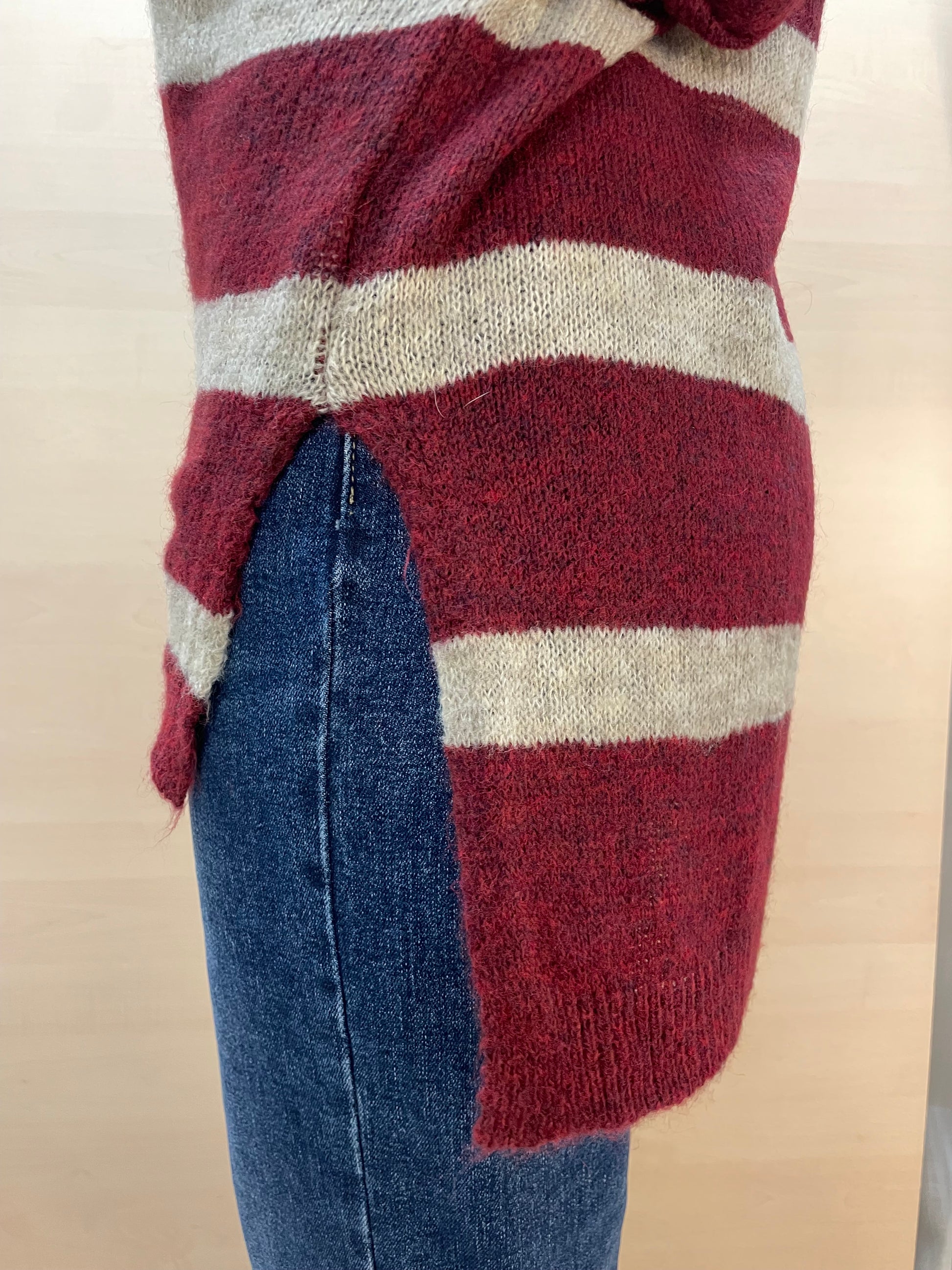 Maglia girocollo a righe nei toni caldi del bordeaux e del beige, realizzata in un tessuto morbido e confortevole. La vestibilità è leggermente over, pensata per offrire un fit rilassato ma sempre curato.