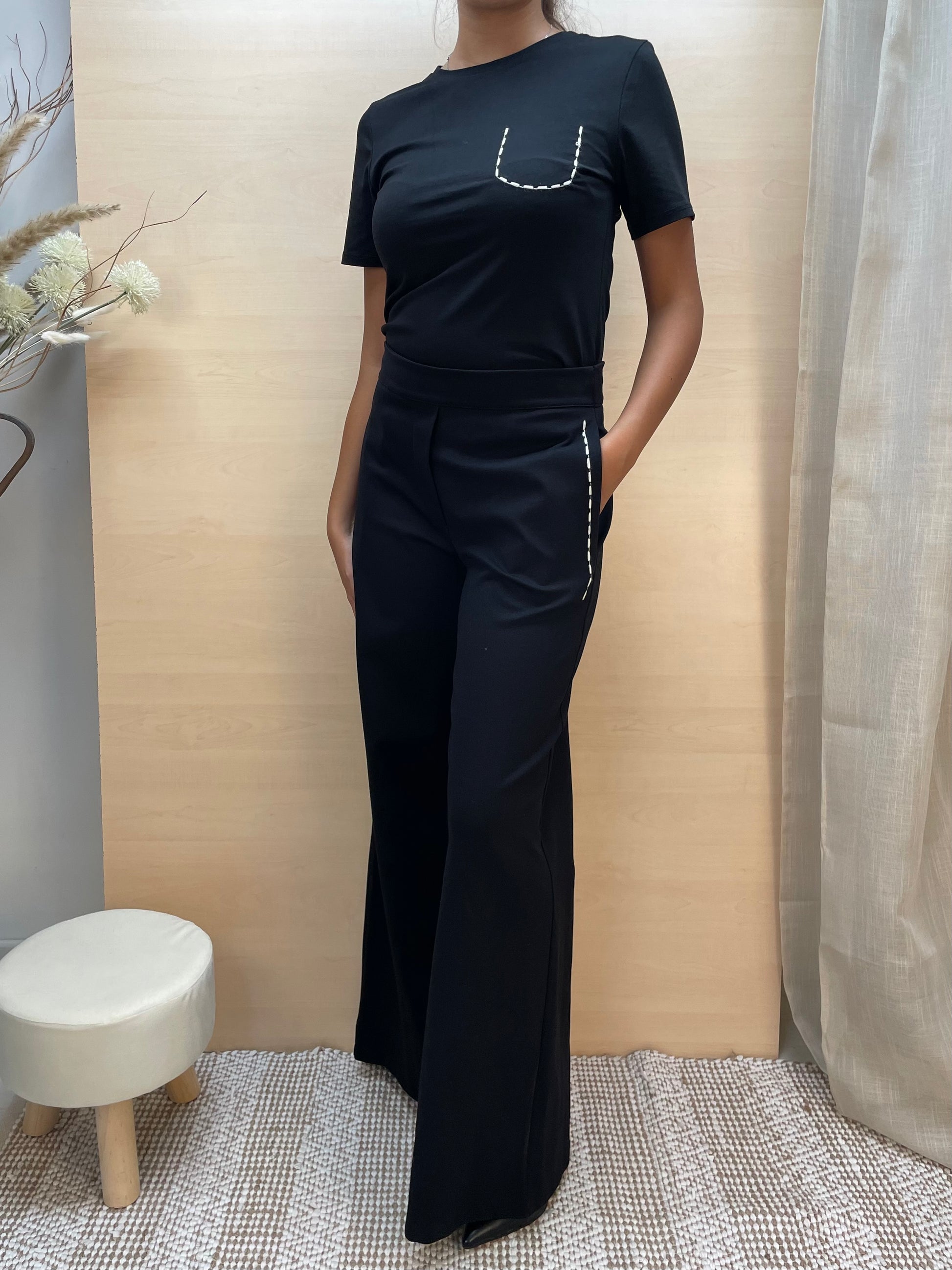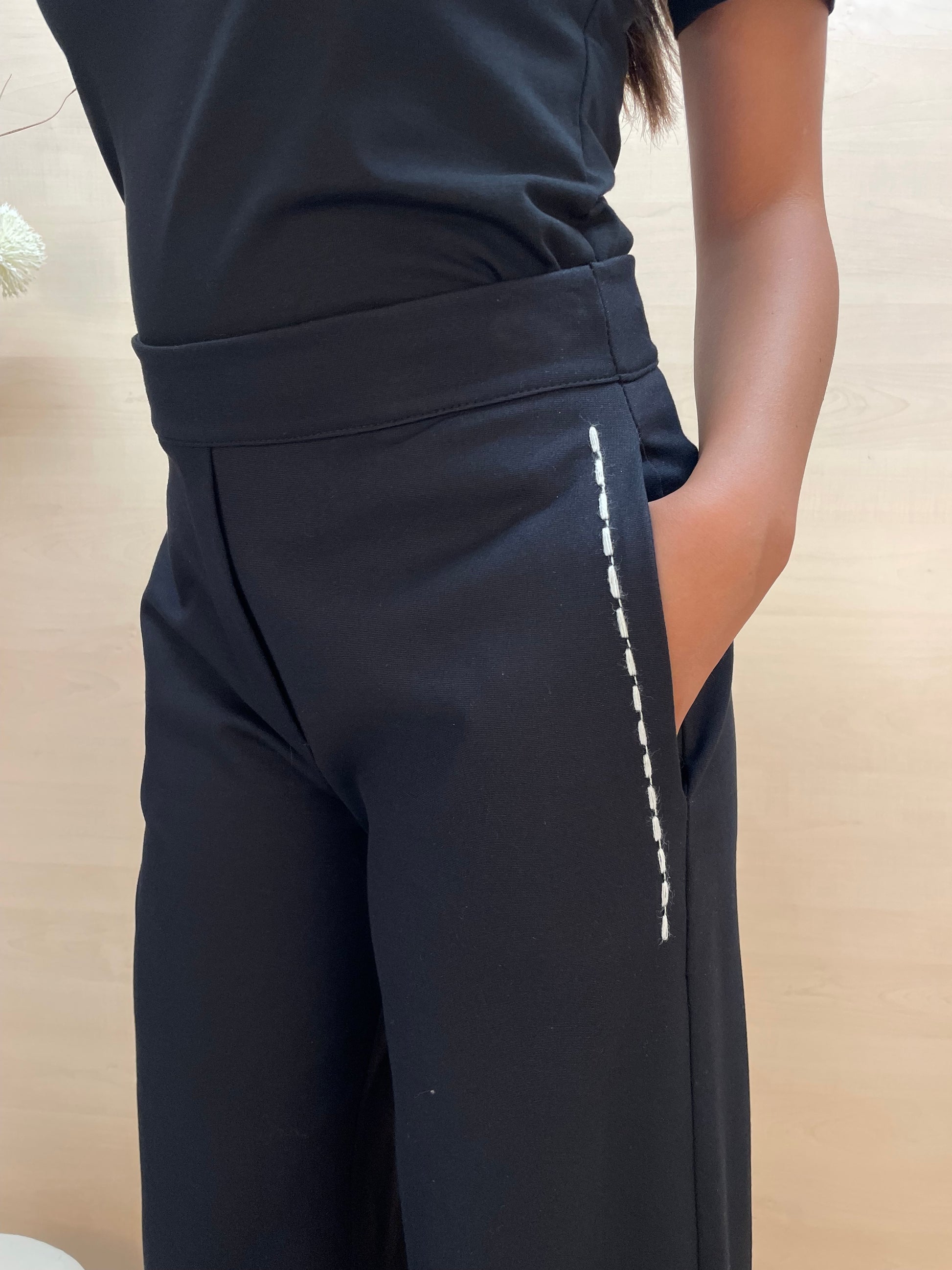 Realizzati in punto Milano, questi pantaloni a colonna uniscono struttura e morbidezza in un equilibrio impeccabile. La linea è dritta, elegante ma disinvolta, pensata per cadere con naturalezza e accompagnare ogni movimento. La chiusura è sul retro, con zip invisibile che mantiene il fronte pulito ed essenziale.