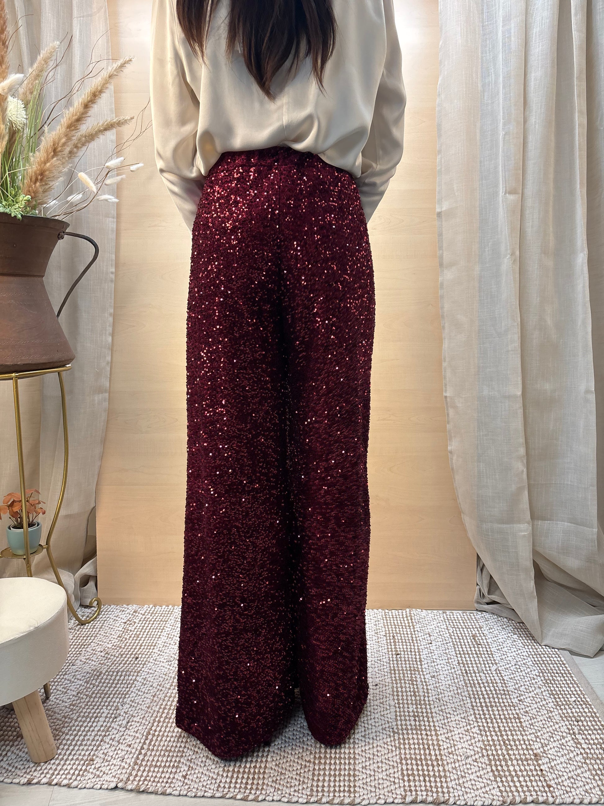 Pantalone palazzo in paillettes. Pantalone foderato internamente. Il pantalone ha l’elastico in vita super confortevole e senza cerniere. Vestibilità regolare.