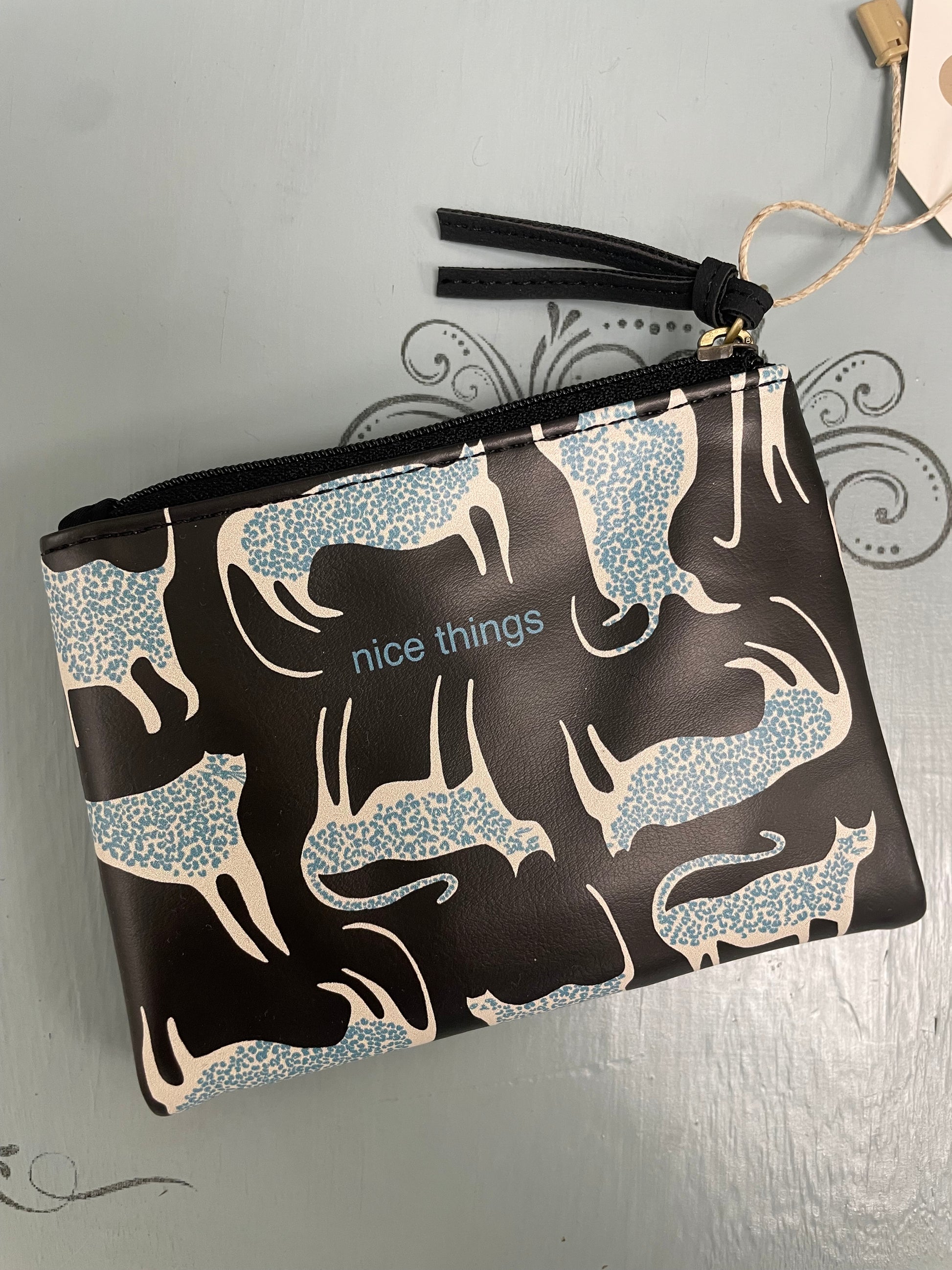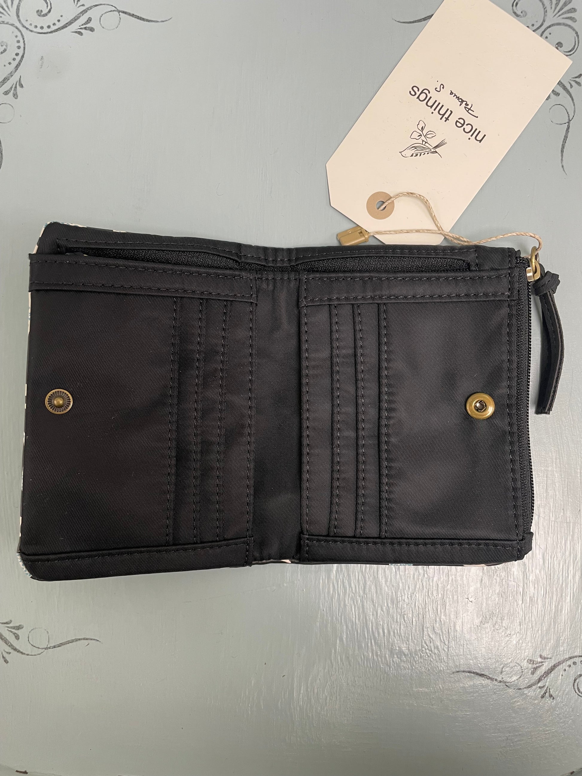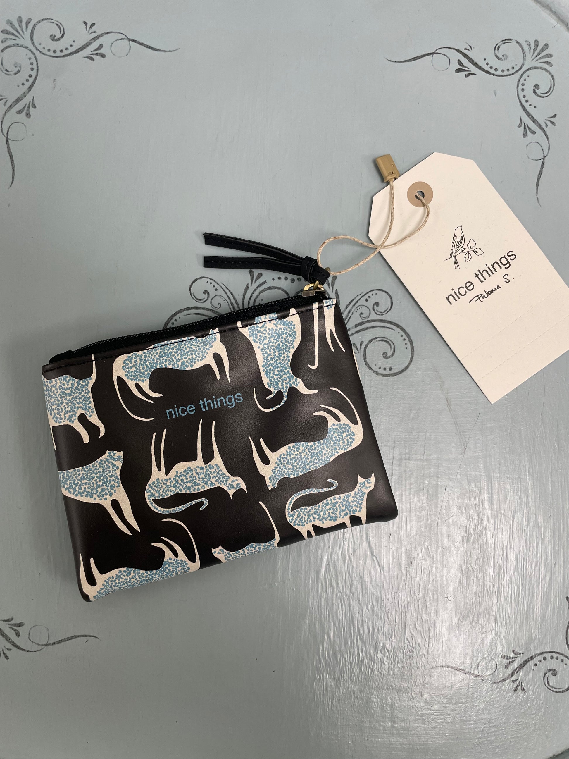 Portafoglio stampato fantasia felina. Scomparto con zip per le monete e scomparti per carte e banconote. Misure: 8,50 cm di altezza x 12 cm di lunghezza x 1,5 cm di profondità.