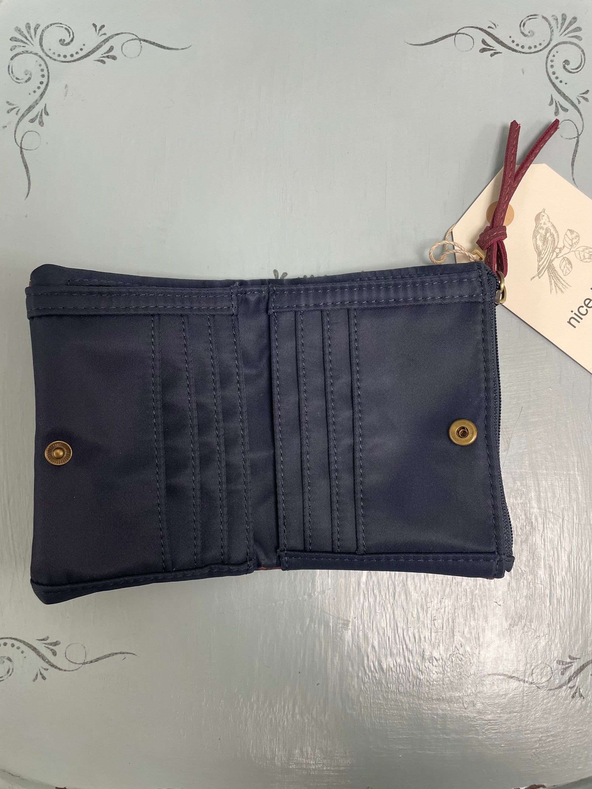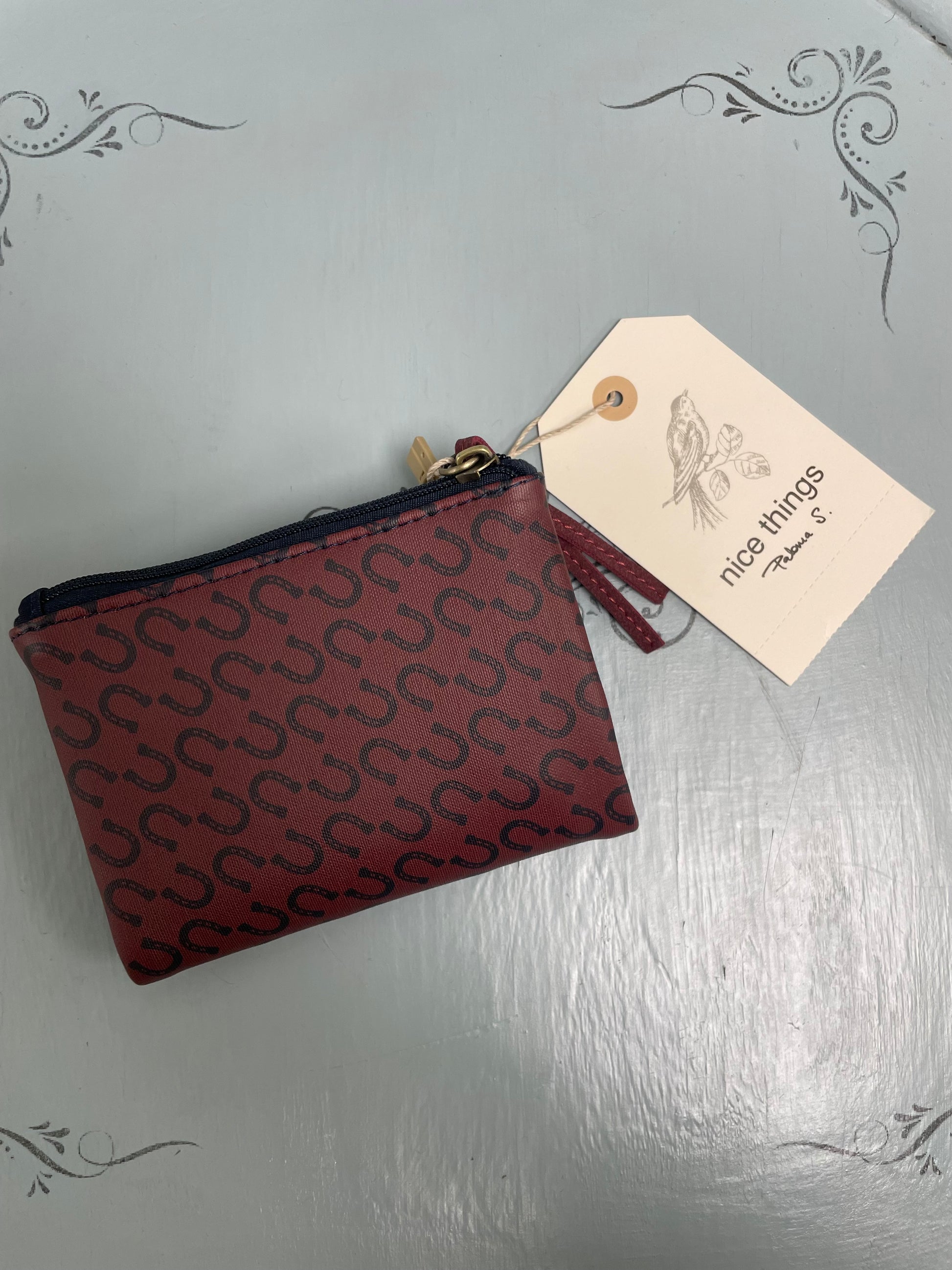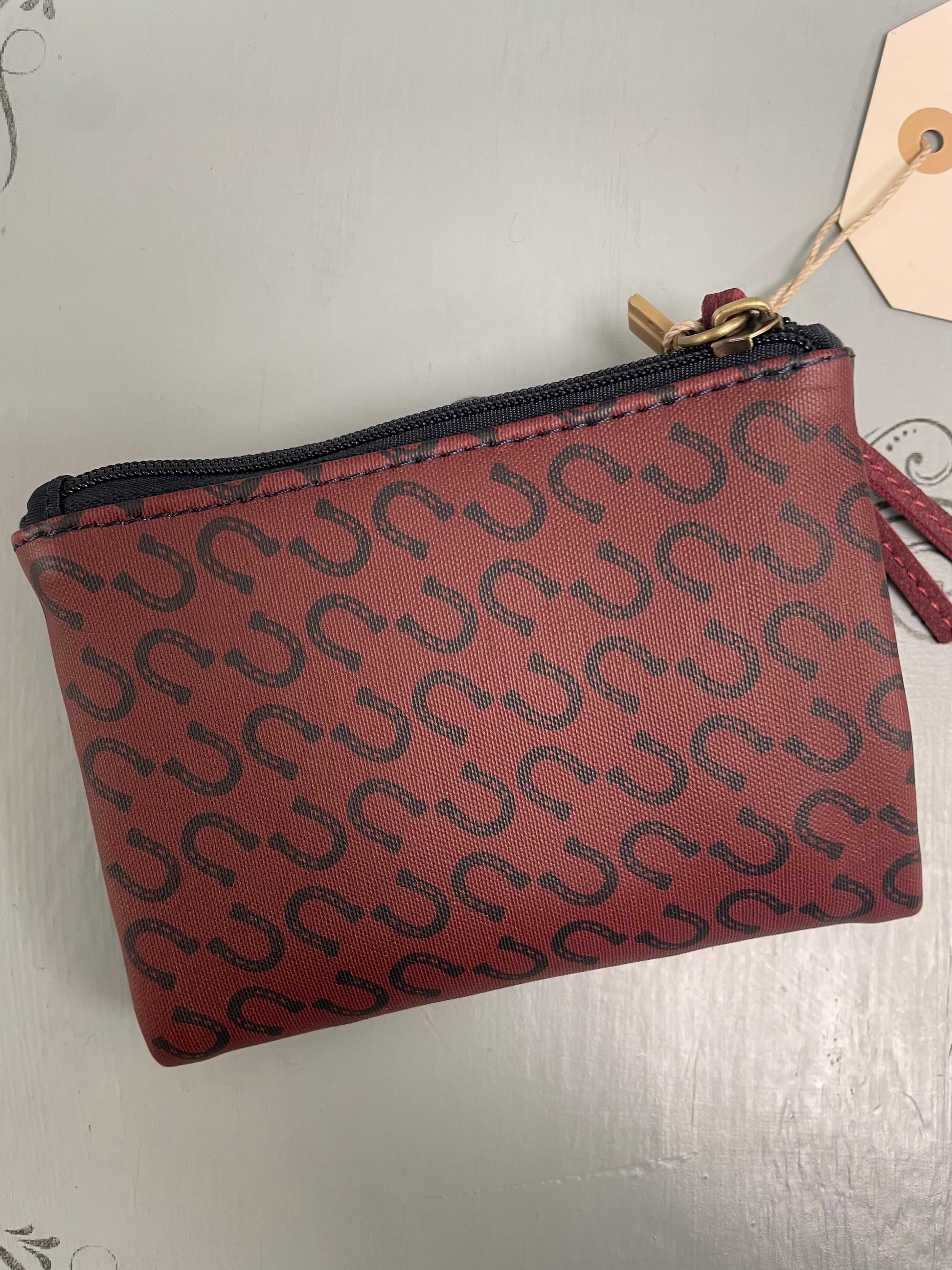 Portafoglio stampato fantasia ferri di cavallo. Scomparto con zip per le monete e scomparti per carte e banconote. Misure: 8,50 cm di altezza x 12 cm di lunghezza x 1,5 cm di profondità.