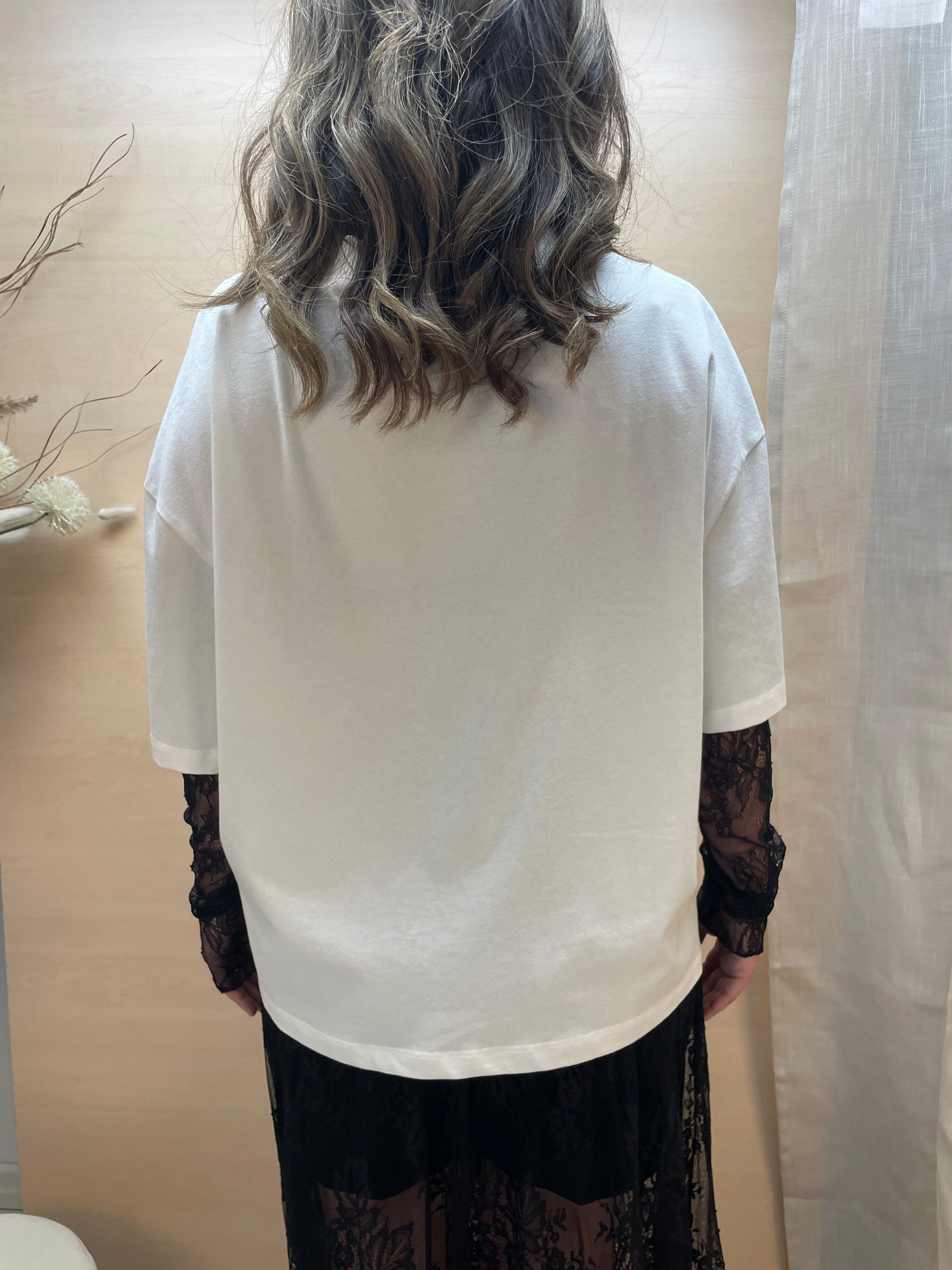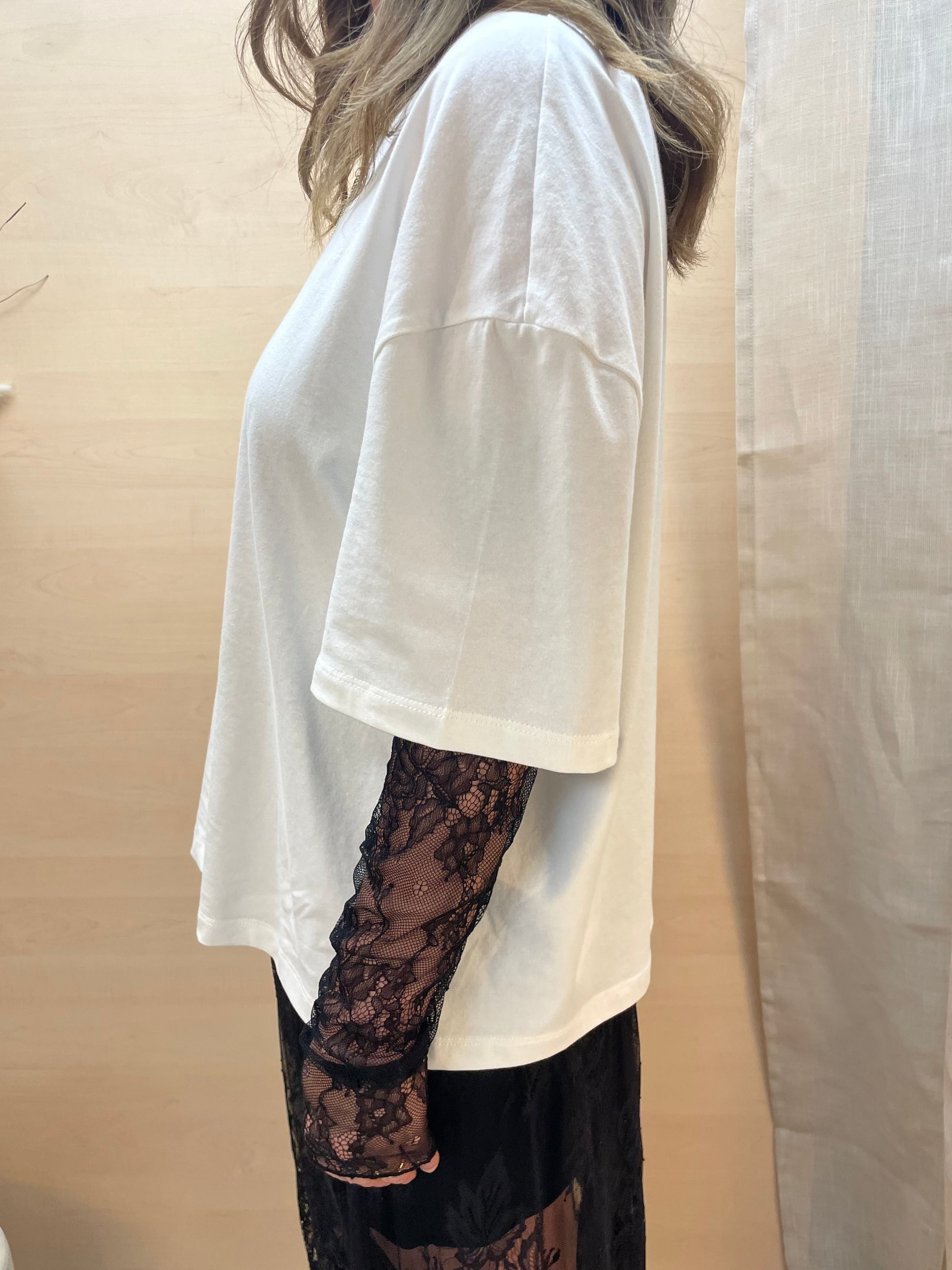 Questa t-shirt oversize bianca è un capo versatile e contemporaneo, perfetto per chi ama giocare con lo stile. La sua particolarità sono le maniche staccabili in pizzo nero, che trasformano un semplice basico in un pezzo unico e ricercato. Puoi indossarla con le maniche per un effetto elegante e sofisticato, oppure senza, come classica t-shirt bianca dal taglio pulito e minimal, ideale per i tuoi look più casual. La vestibilità oversize la rende comoda e adatta a diverse fisicità: la taglia M, infatti, veste fino a una 2XL, abbracciando con naturalezza linee e forme diverse.