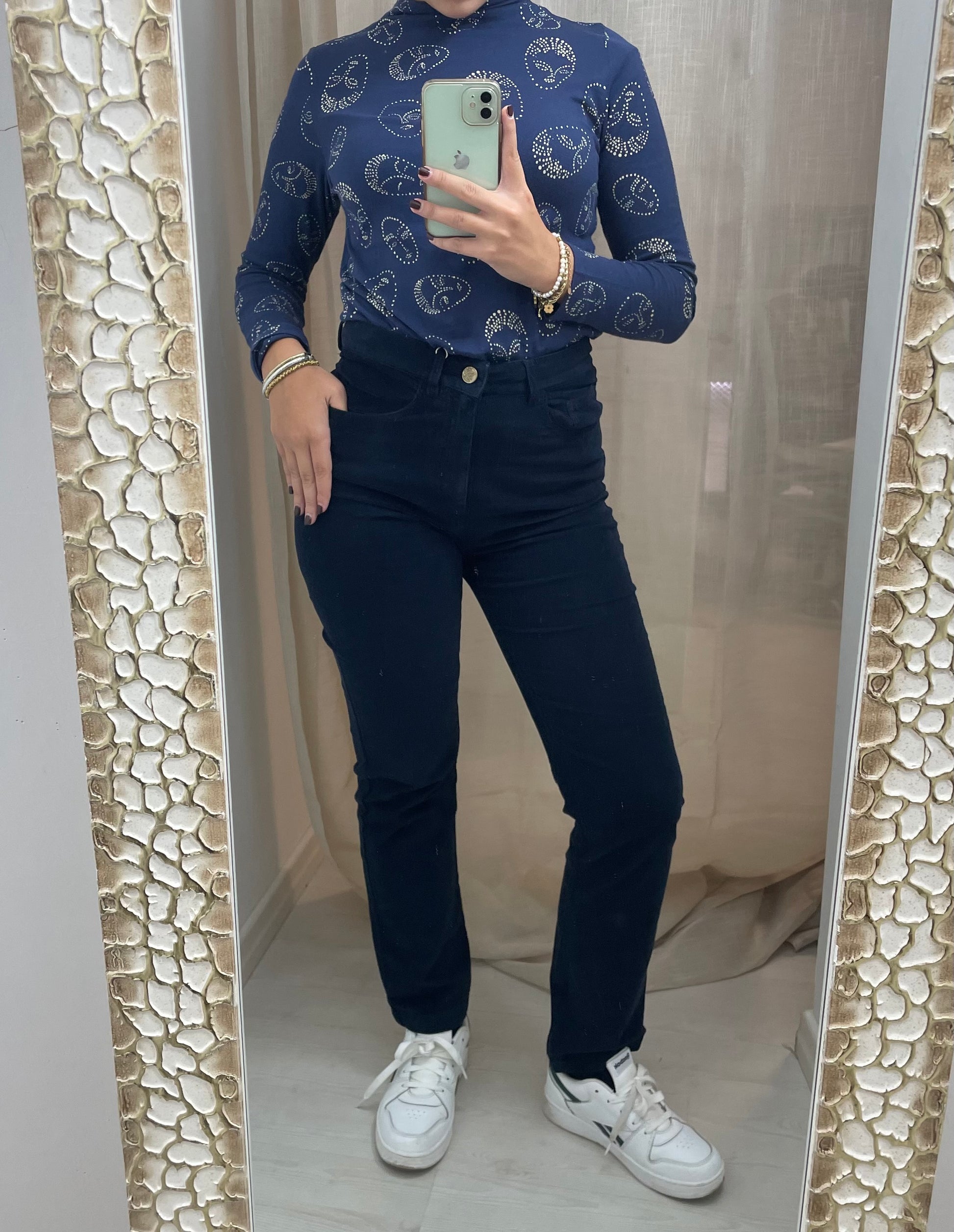 La modella è alta 1,60 e pesa 54 kg, indossa la taglia S.
