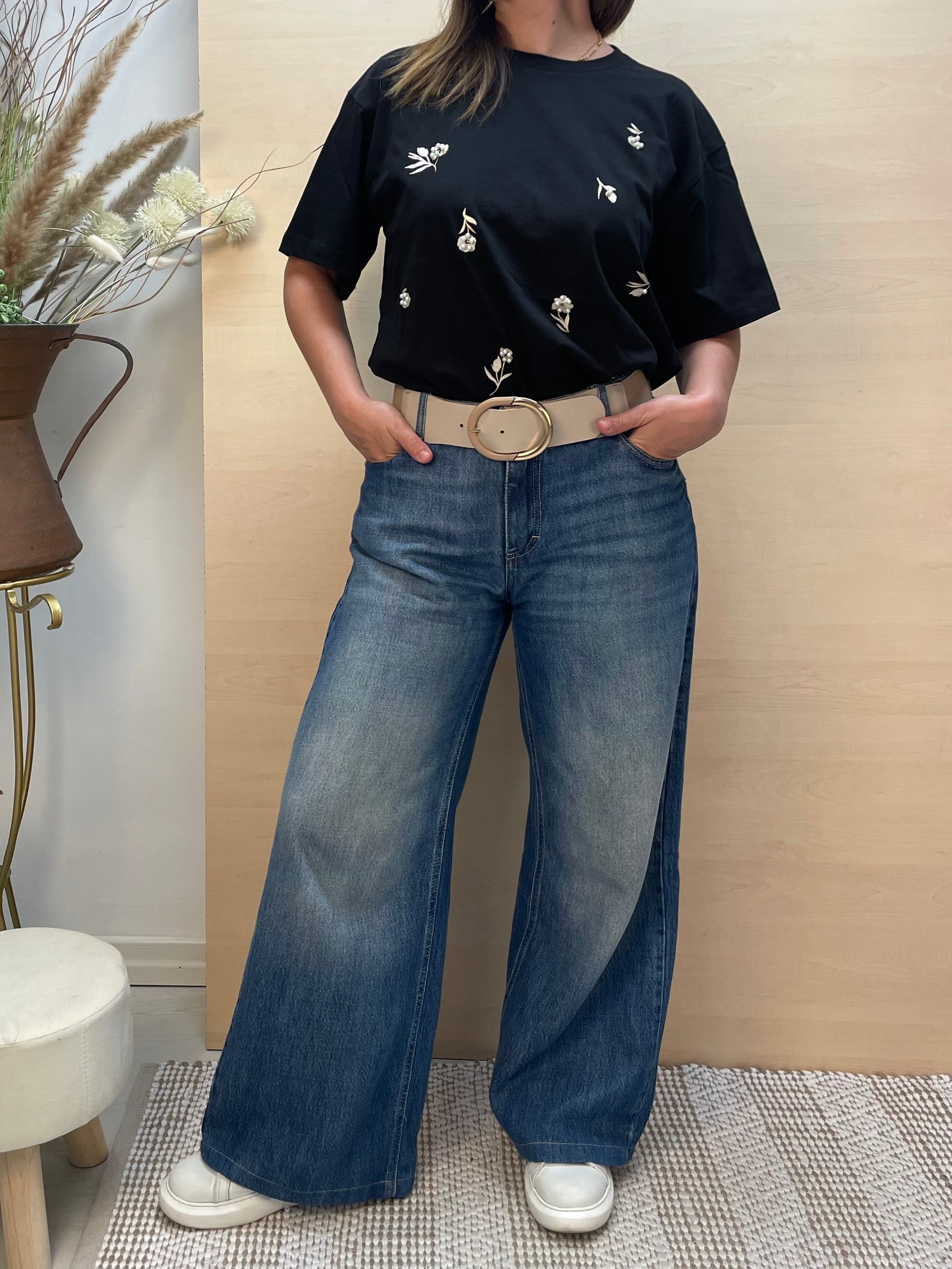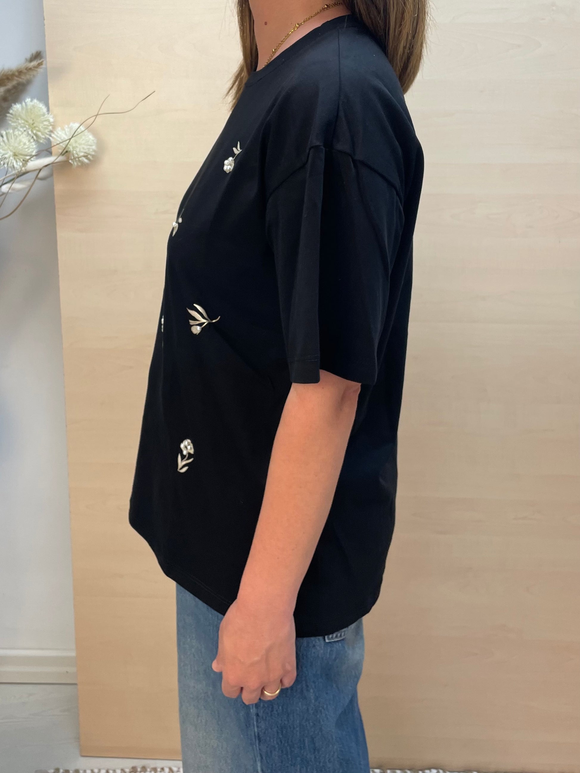 Questa t-shirt nera in 100% cotone gioca con i contrasti tra casual ed elegante, grazie alle stampe dorate a tema floreale arricchite da delicati dettagli di piccole perle. Il design pulito e la vestibilità versatile la rendono perfetta per ogni occasione. Un capo che illumina il guardaroba con discrezione e stile.