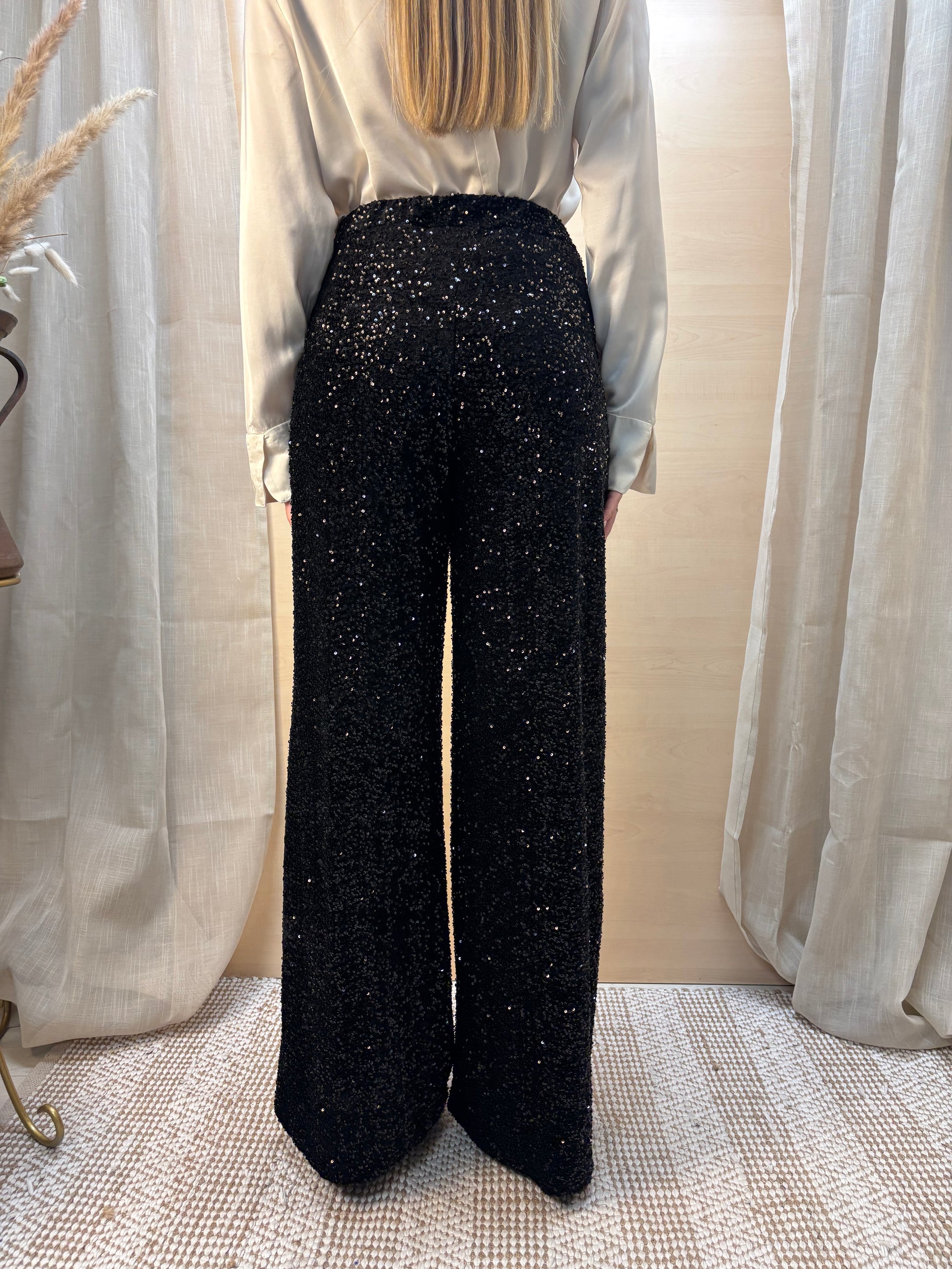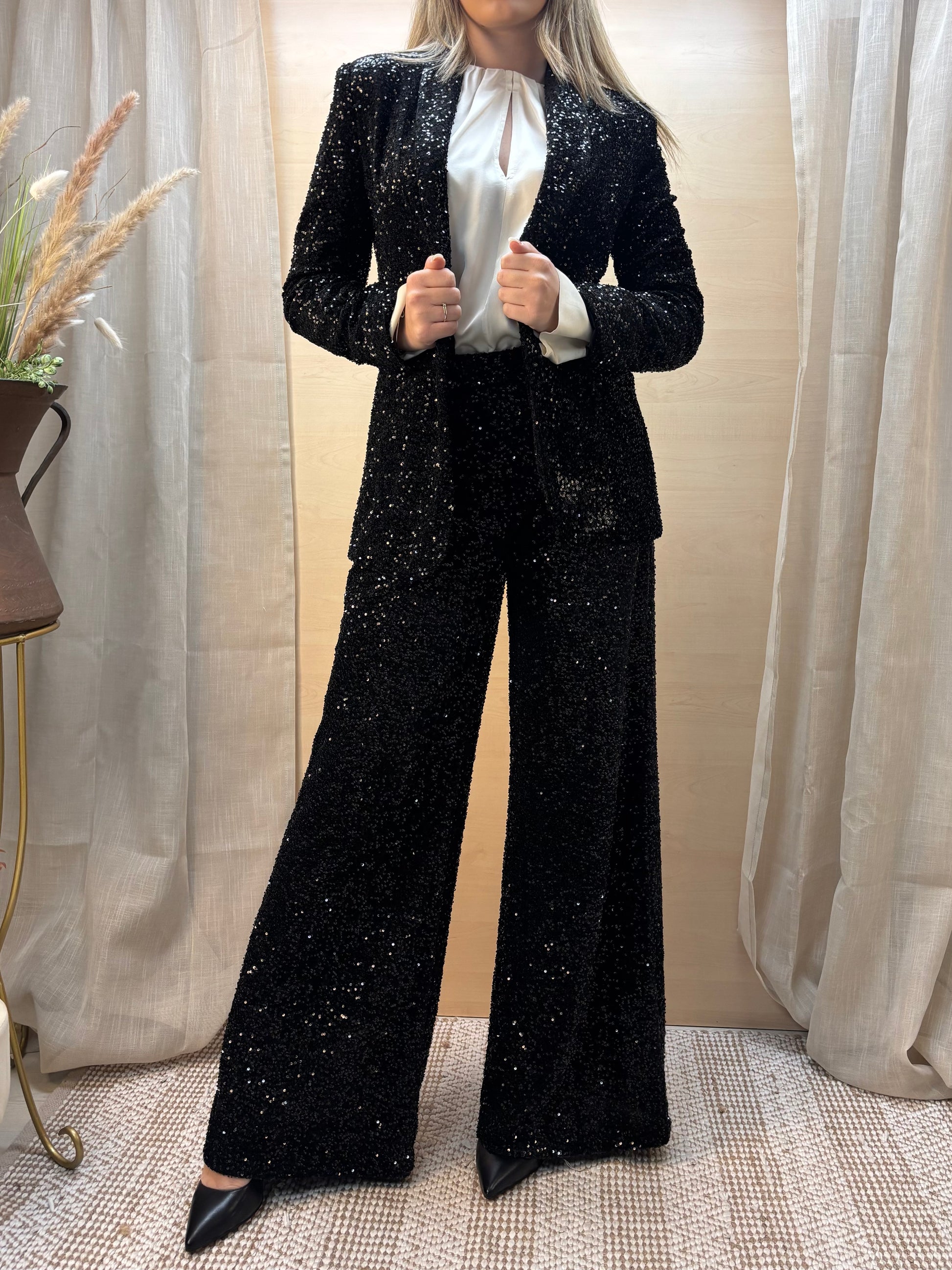 Completo 2 pezzi giacca e pantalone in paillettes. Giacca foderata. Pantalone foderato internamente. Il pantalone ha l’elastico in vita super confortevole e senza cerniere. Vestibilità del pantalone regolare. Vestibilità della giacca slim.