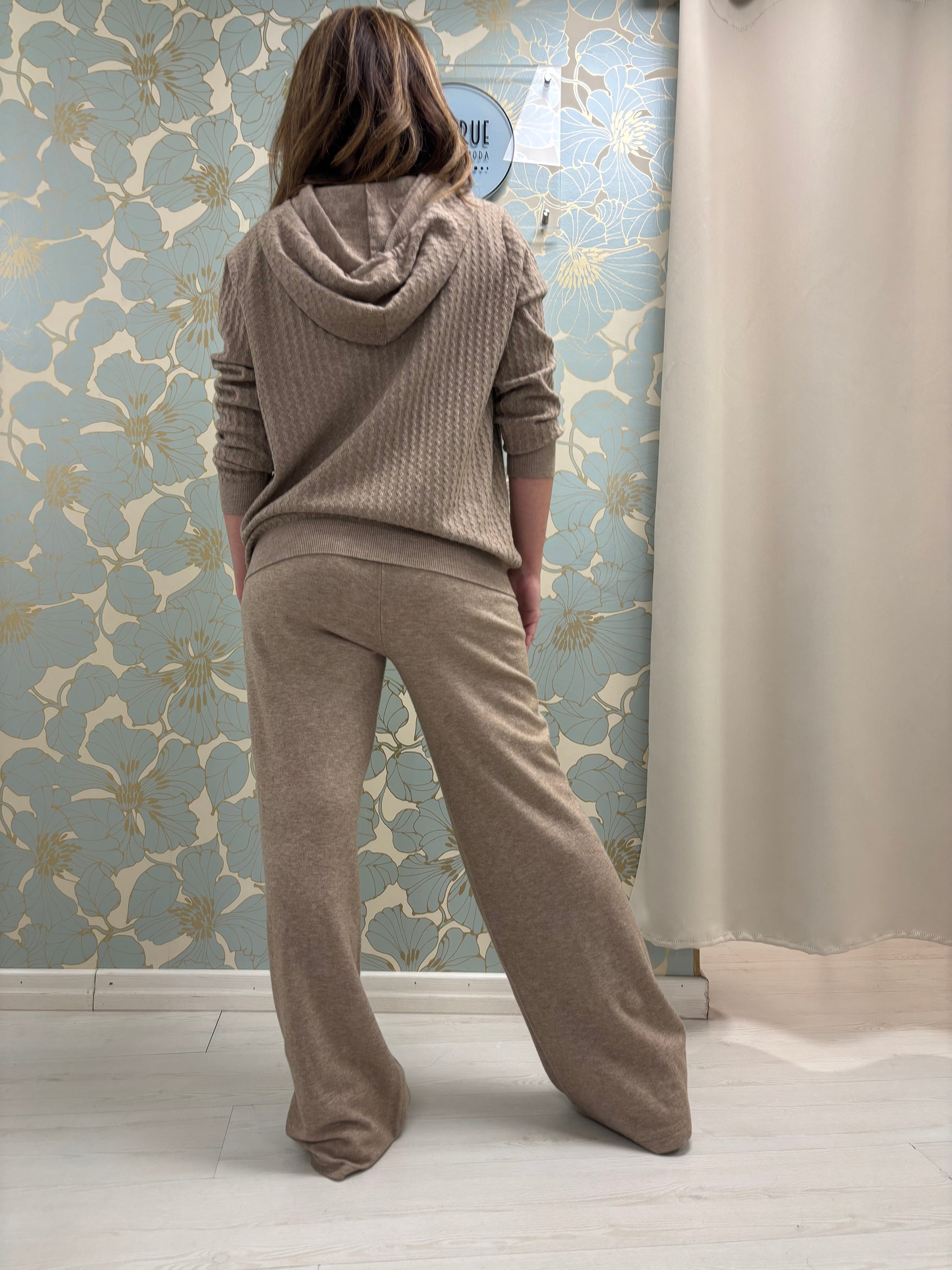 Tuta in due pezzi, composta da maglia e pantalone, realizzata in filo morbidissimo per un comfort assoluto con un tocco di stile.